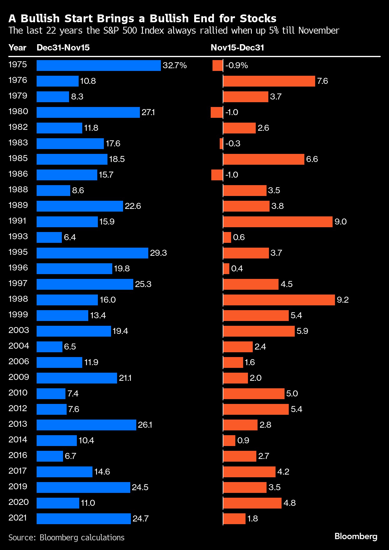 In the past 22 years, when the S&P 500 was up 5% or more by mid-November, the remainder of that year was positive every single time, according to data compiled by Bloomberg. Go back 50 years, and that setup was positive 26 out of 30 times, with the decline in the four exceptions being 1% or less.