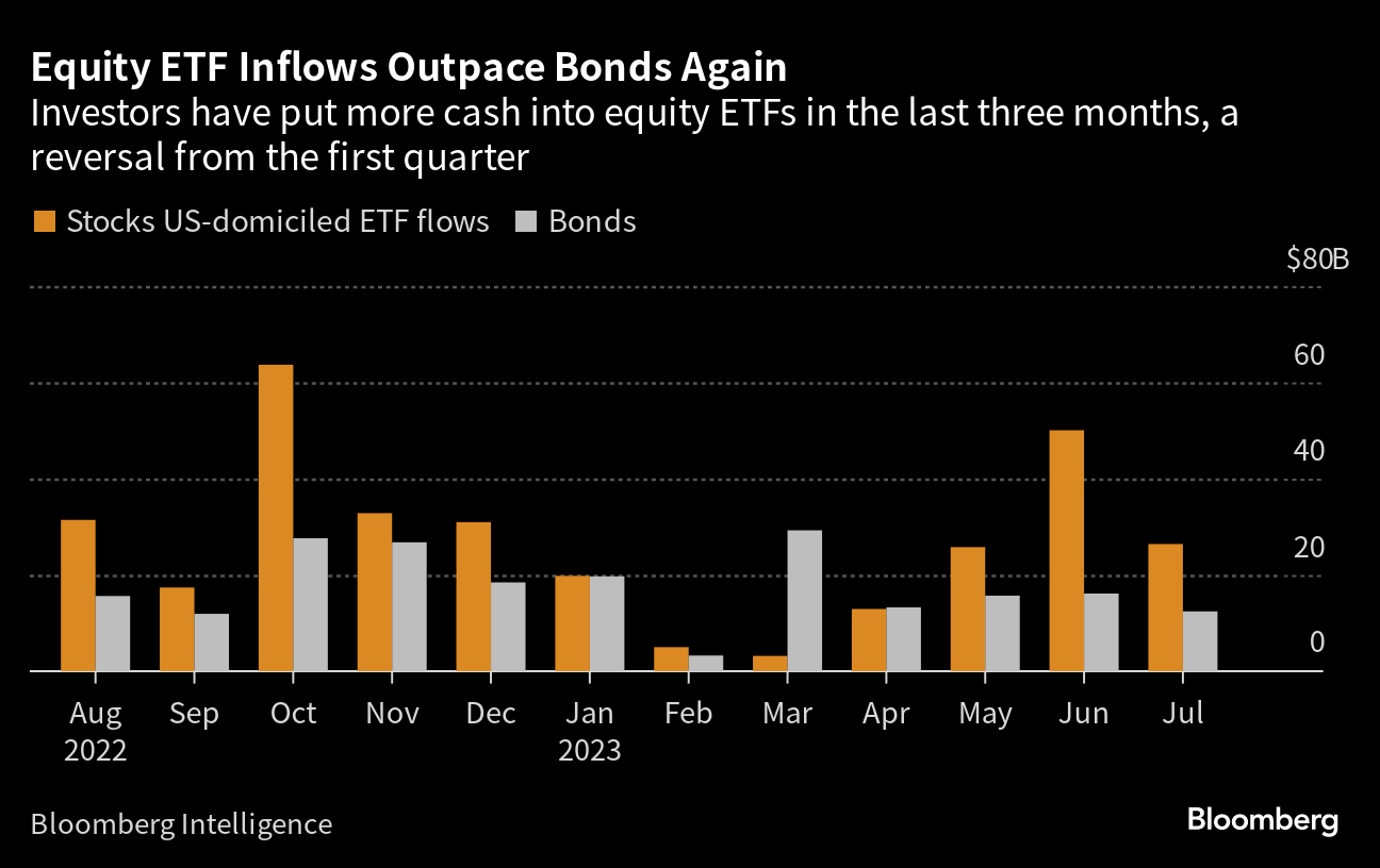 That's already happening. Discretionary investors — who allocate cash based on their view of the economy — have ramped up their pace of stocks buying on par with the time of the vaccine announcement in late 2020, according to Deutsche Bank AG. Flows into exchange-traded funds show a strong preference for equities over fixed income in the last three months, a big reversal from the start of the year.