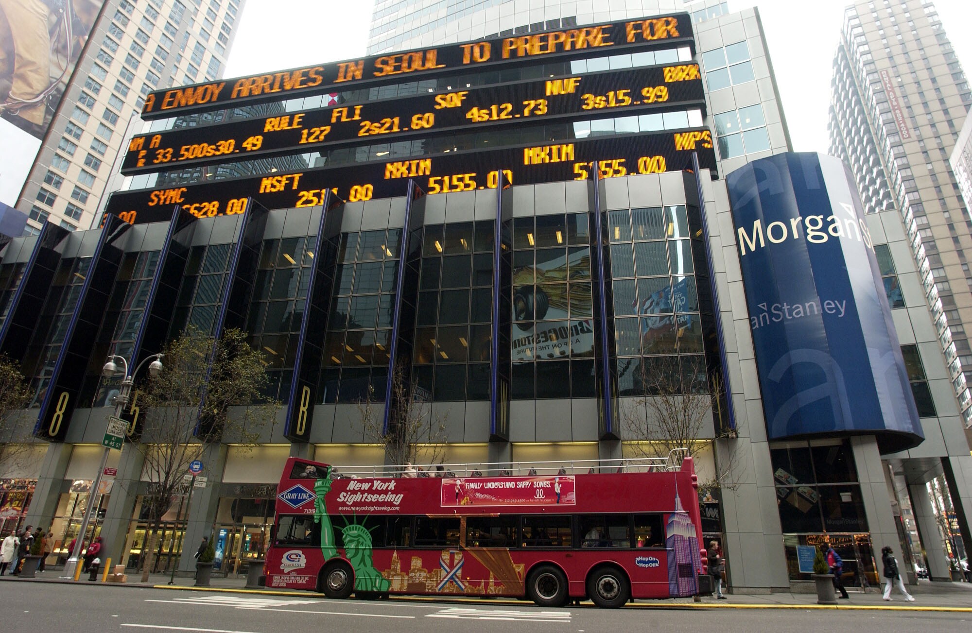 A New York Sightseeing tour bus sits outside the Morgan Stanley building in New York. (Photographer: Daniel Acker/Bloomberg News.)