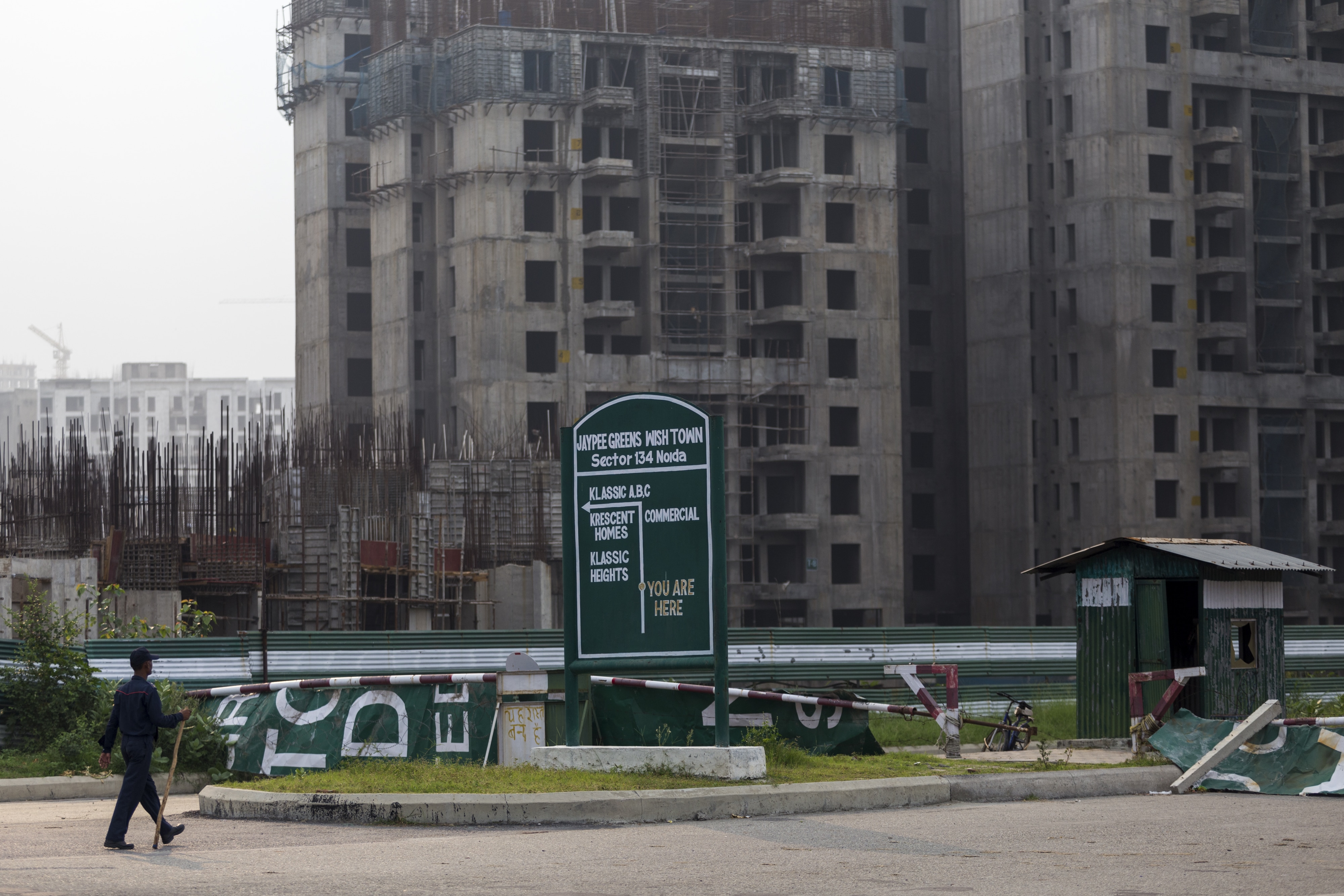 A security guard walks towards residential buildings under construction at the Jaypee Wish Town Project, developed by Jaypee Infratech. (Photographer: Prashanth Vishwanathan/Bloomberg)