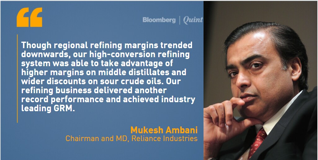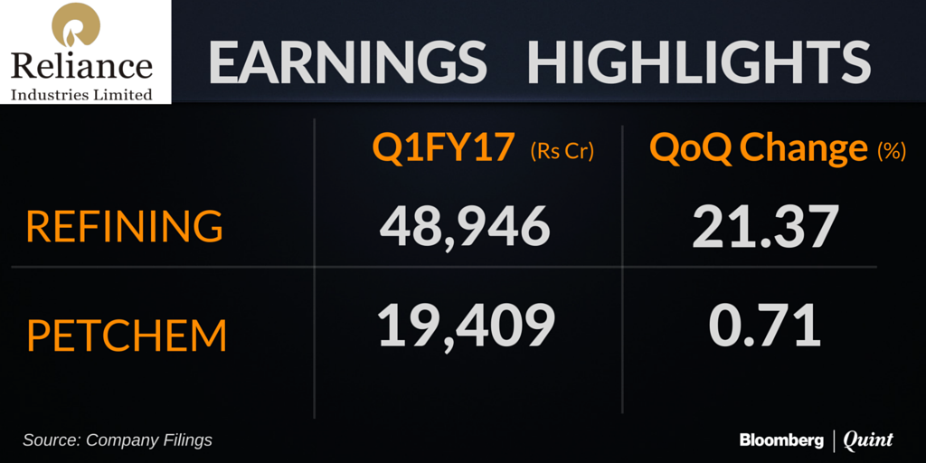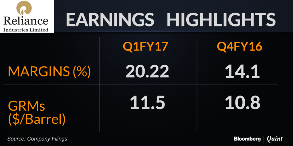 Reliance Industries Ltd. reported a net profit that beat analyst estimates, on the back of a strong profit margin in the refining business . Profit rose 4.4 percent to Rs 7,548 crore for the first quarter of the financial year 2017, when compared to the January - March period, surpassing the Bloomberg consensus estimate of Rs 6,441 crore. On a year-on-year basis, net profit increased 18.5 percent.