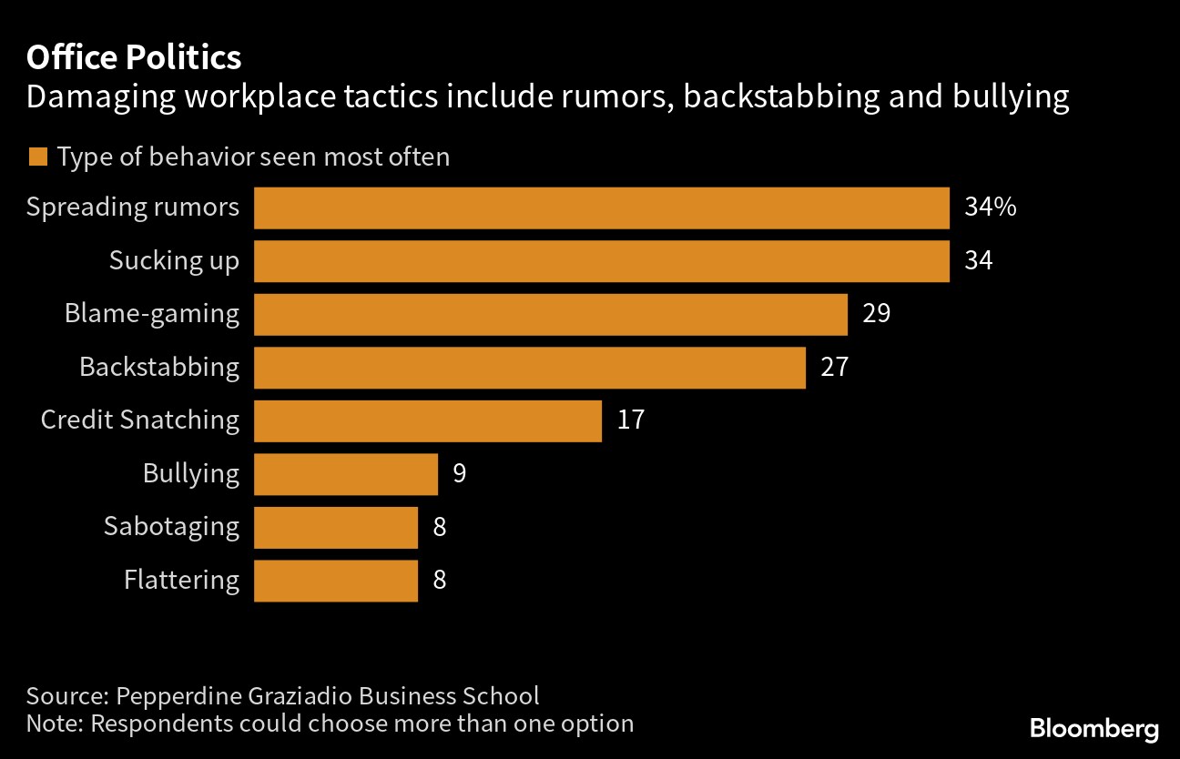 “Work is different today, so office politics is emerging in different ways,” said Dana Sumpter, an associate professor of organization theory and management at Pepperdine University's Graziadio Business School, who co-authored the research. “When you're working remotely, it's more difficult to get quality time with managers. So people might resort to sucking up to get that attention.”More than one-third of the surveyed workers said rumor spreading and excessive flattery toward bosses were the most common upsetting behaviors they witnessed, followed by blame-gaming, backstabbing and credit snatching. Rounding out the list were bullying and sabotaging. Half of those polled said they felt pressured to engage in such behaviors, and one in four has quit a job over it.