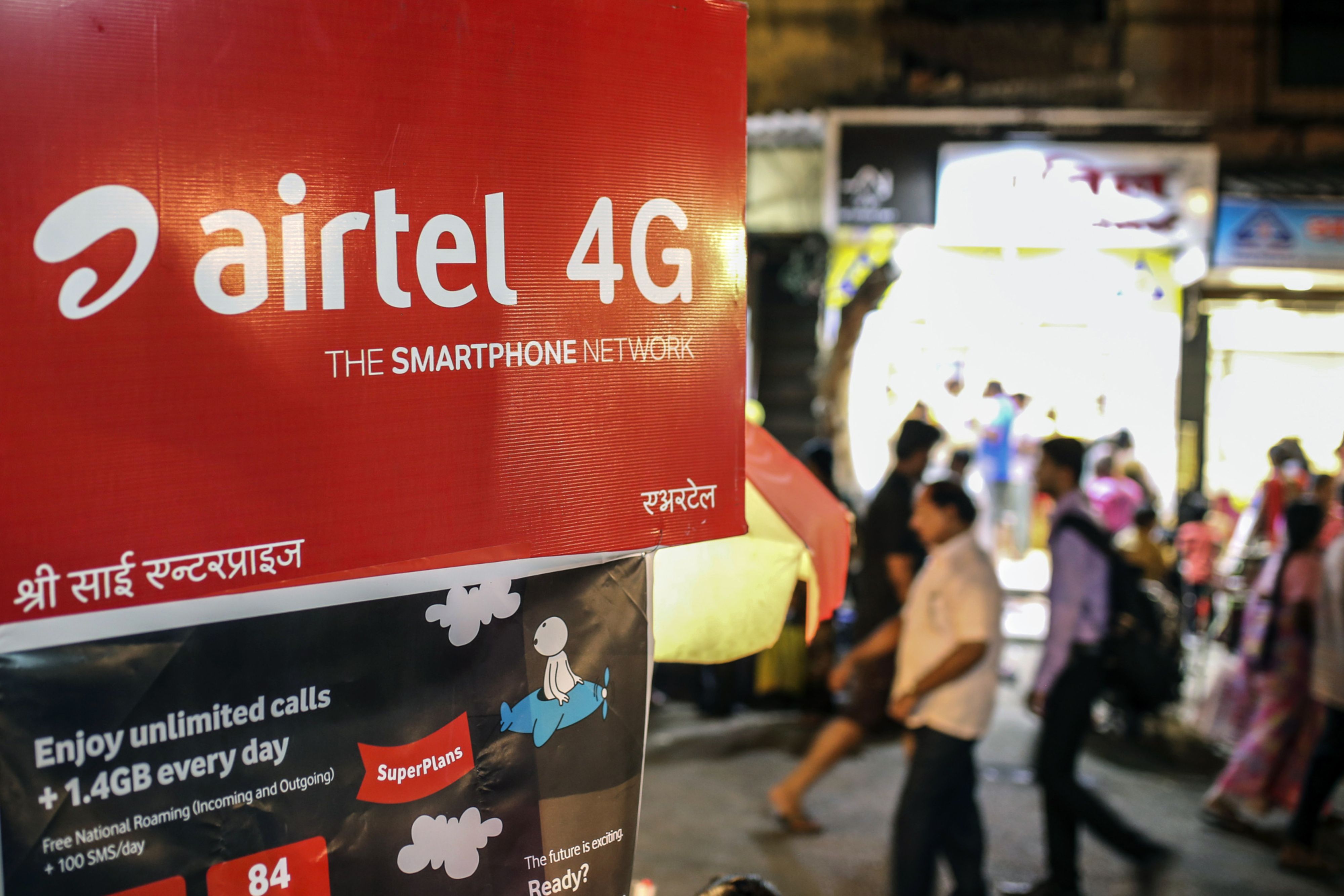 Pedestrians walk past an advertisment for Bharti Airtel Ltd. in Mumbai. (Photographer: Dhiraj Singh/Bloomberg)