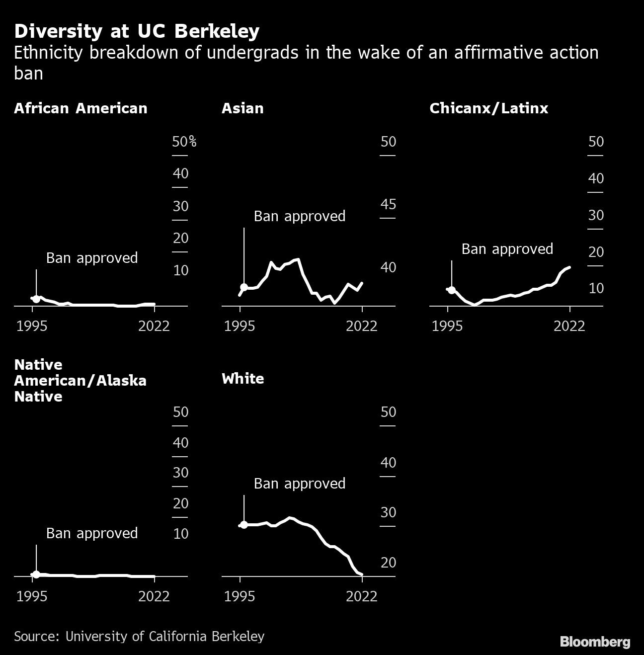 UC Berkeley saw a similar drop: Black students comprised 3.4% of the freshman class in 1998, down from 6.3% in 1995. The share of Latinx freshman dropped to 7.3% from 16% in that time.