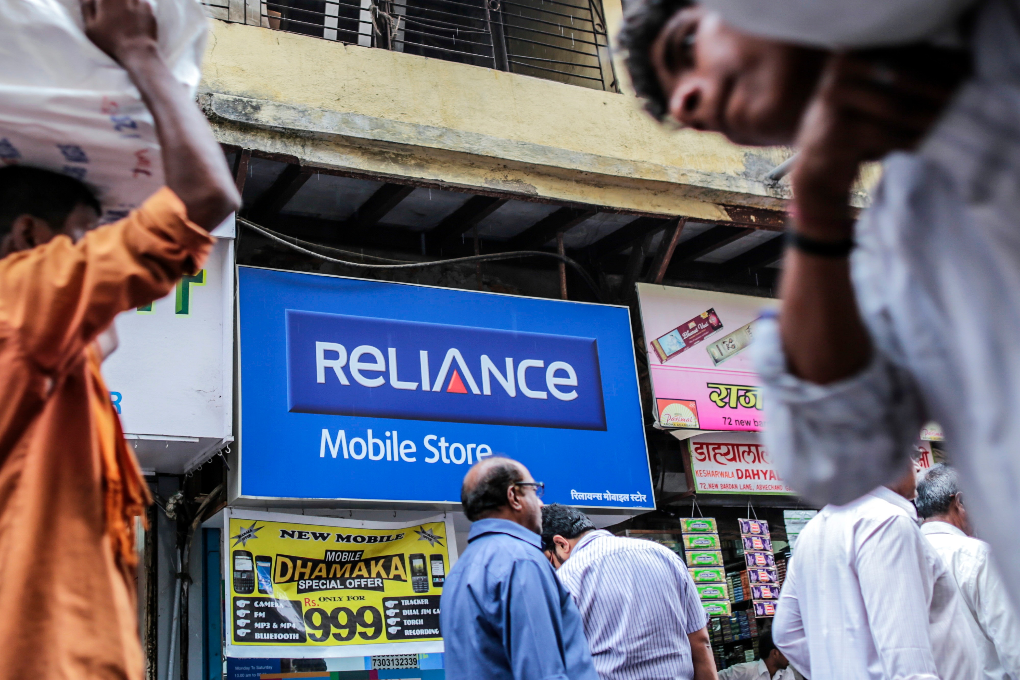 Pedestrians walk past a Reliance Communications Ltd. Mobile Store in Mumbai, India. (Photographer: Dhiraj Singh/Bloomberg)