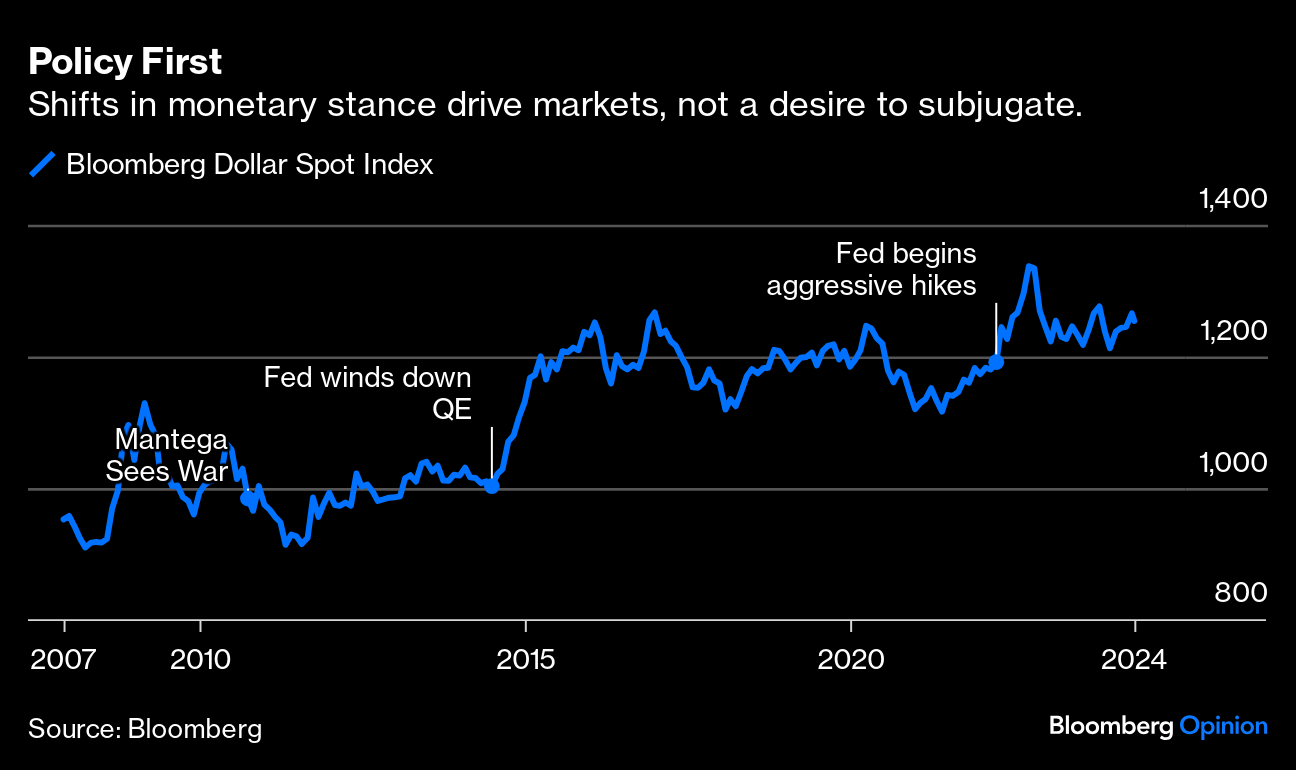 Which gets us to the current moment. The dollar's strength rests in part on the prolonged US expansion — many economists predicted a recession by now — and expectations that Fed rate cuts will be delayed. Again, this begs the counterfactual question: What is the Fed supposed to do? Cut when inflation is proving just a bit too stubborn and the labor market is robust?