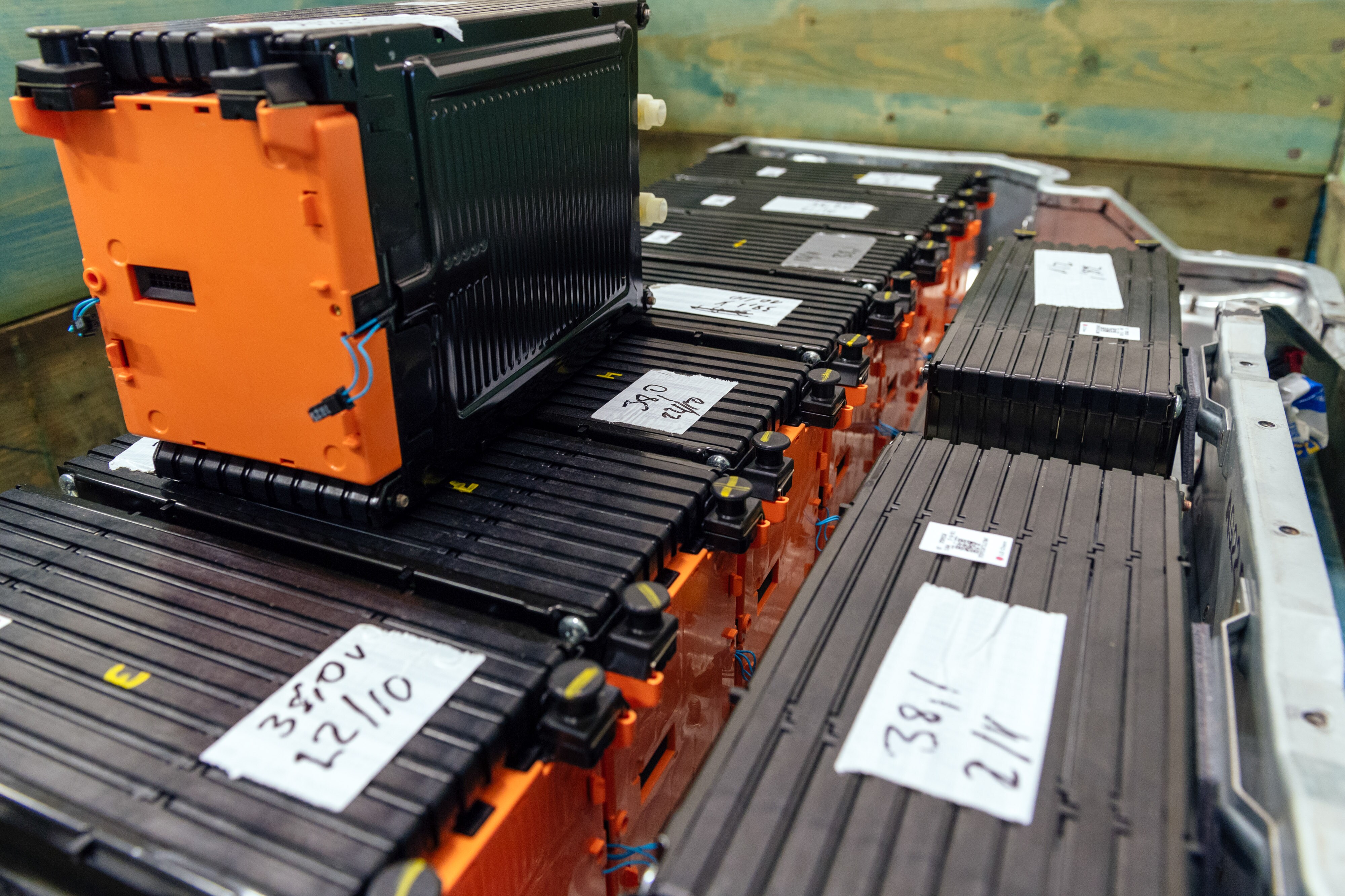 Used electric vehicle batteries sit at the Box of Energy AB headquarters in Gothenburg, Sweden. (Photographer: Mikael Sjoberg/Bloomberg)