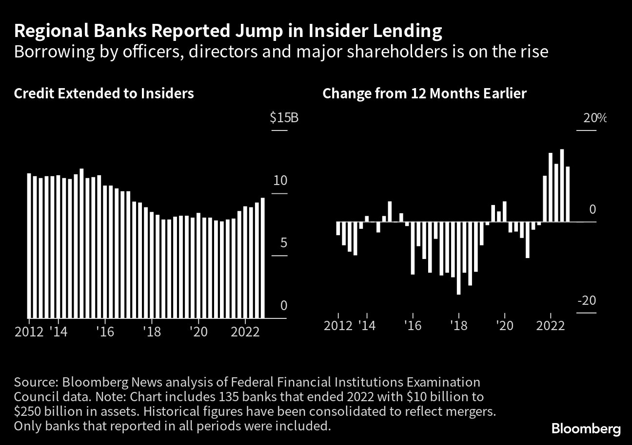 The trend continued through all of last year, reaching almost $10 billion by the end of 2022, according to a Bloomberg News analysis of data submitted to federal regulators. That was 12% more than a year earlier and represented the largest annual jump in lending to insiders, along with their related interests, in at least a decade.