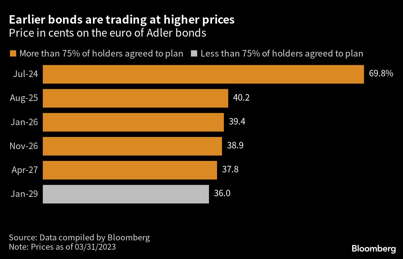 A restructuring proposal in Germany was accepted by a majority of bondholders, but rejected by the owners of more than a quarter of Adler's longest dated notes. For the plan to be enacted, Adler needed the support of more than 75% of each class of bondholder.