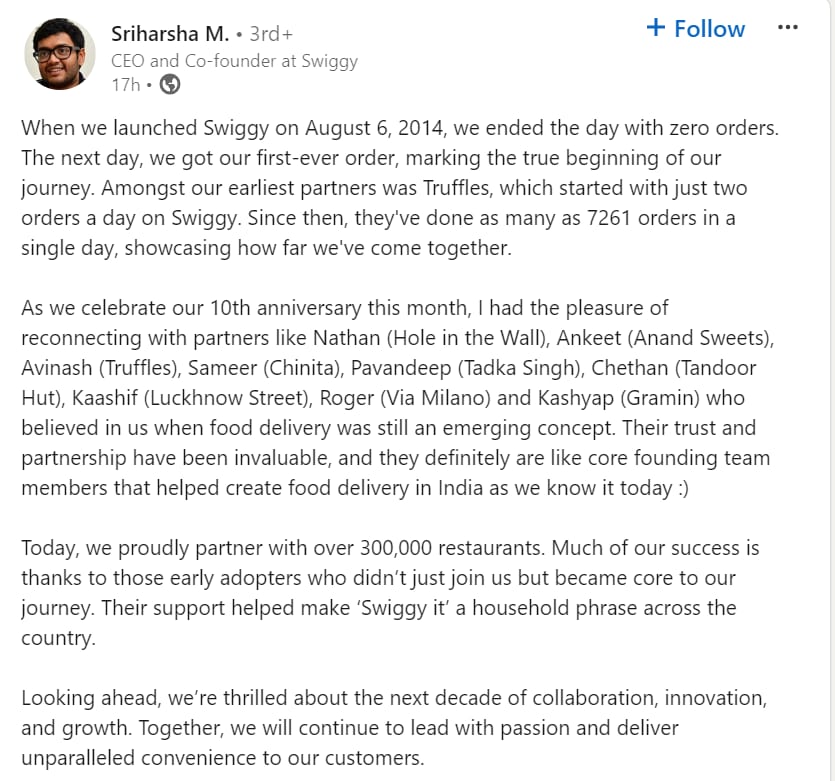 "As we celebrate our 10th anniversary this month, I had the pleasure of reconnecting with partners like Nathan (Hole in the Wall), Ankeet (Anand Sweets), Avinash (Truffles), Sameer (Chinita), Pavandeep (Tadka Singh), Chethan (Tandoor Hut), Kaashif (Luckhnow Street), Roger (Via Milano) and Kashyap (Gramin) who believed in us when food delivery was still an emerging concept," the CEO said.