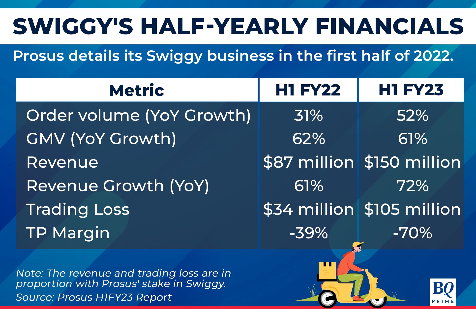 The mounting loss, however, is a fly in the ointment. Prosus' share of Swiggy's trading loss from operations surged to $105 million in January-June 2022 from $34 million in the year-ago period, as the foodtech startup stepped up investments in its food-delivery business as well as Instamart to drive growth and expand footprint.