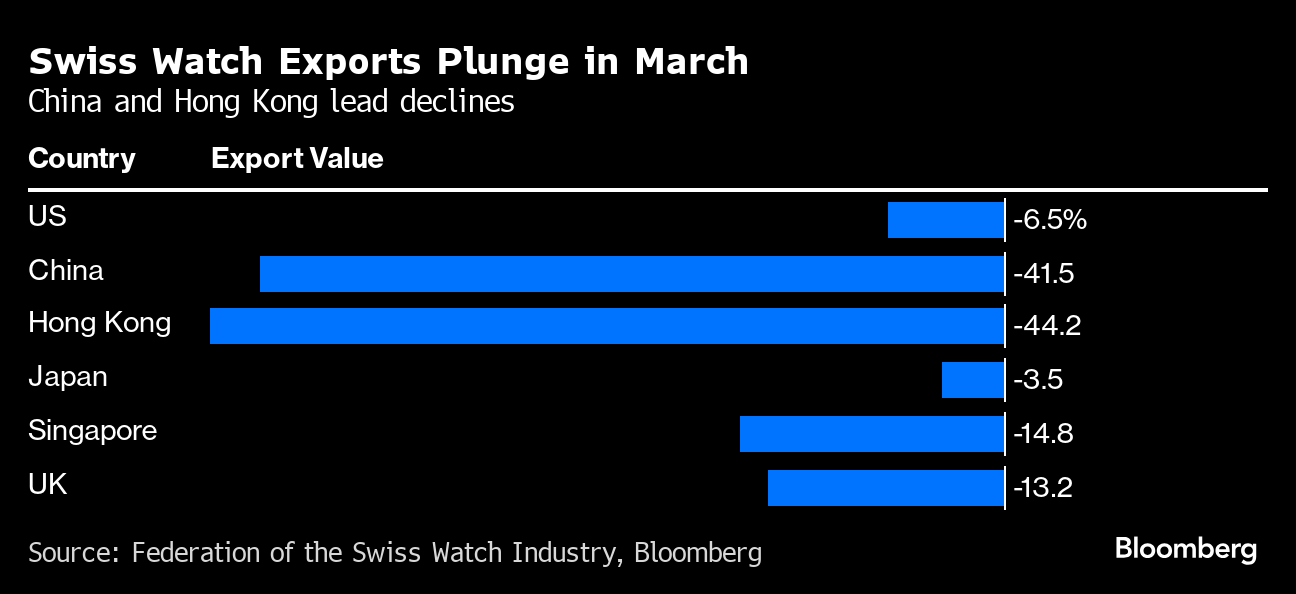 (Bloomberg) -- Monthly Swiss watch exports suffered their biggest decline since 2020 as demand for premium and luxury timepieces in key markets including China and Hong Kong plunged.