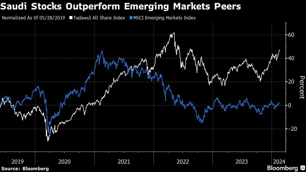 The kingdom makes up 4.3% of the MSCI Emerging Markets Index, an increase from about 1.5% when it was first included in the benchmark in 2019 and has outperformed ever since. The Tadawul All Share Index's gains have extended this year, with the benchmark rising for the past 13 days, the longest such streak since 2003.