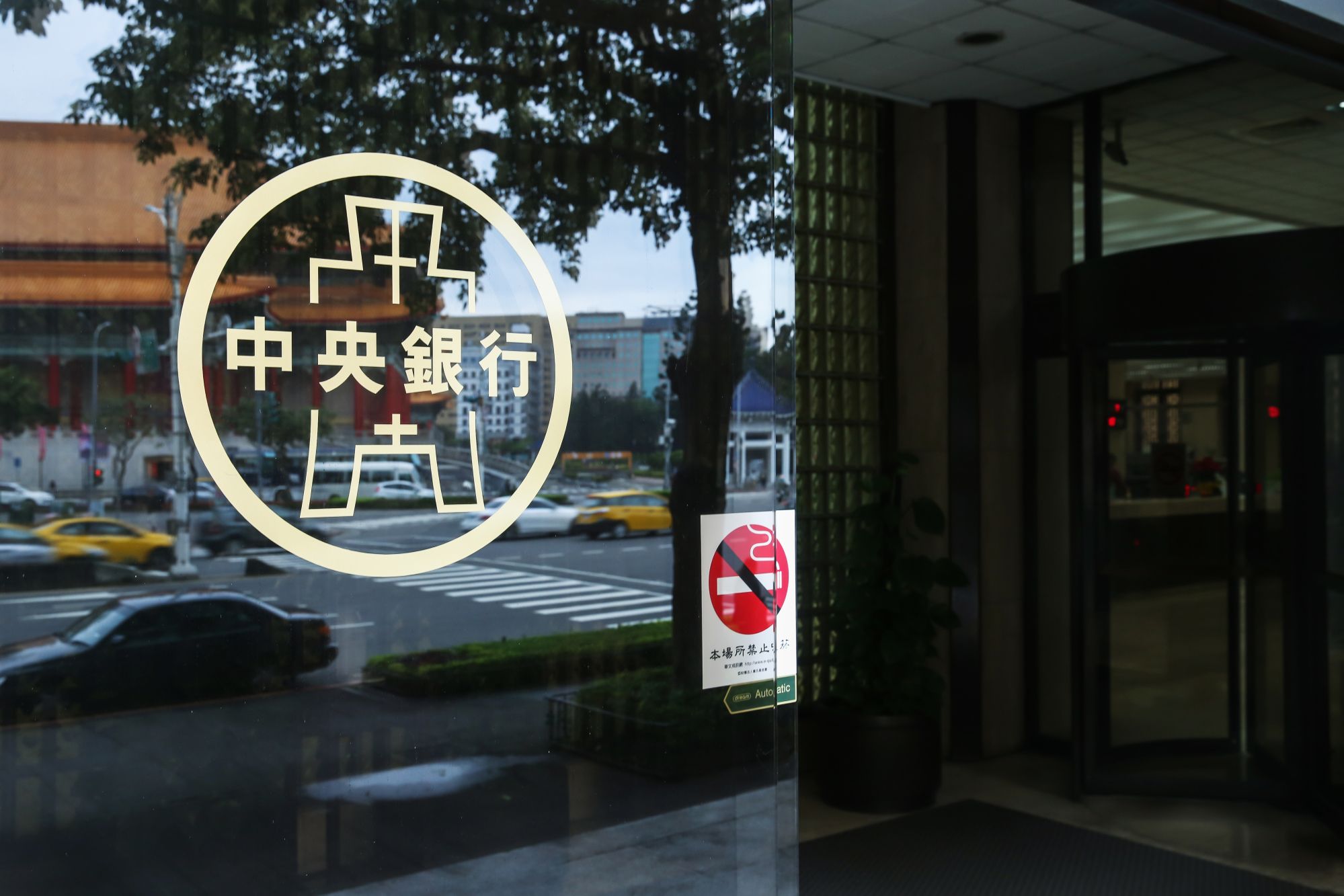 The logo for the Taiwan Central Bank is displayed on a window at the bank's headquarters building in Taipei, Taiwan. (Source: Bloomberg)