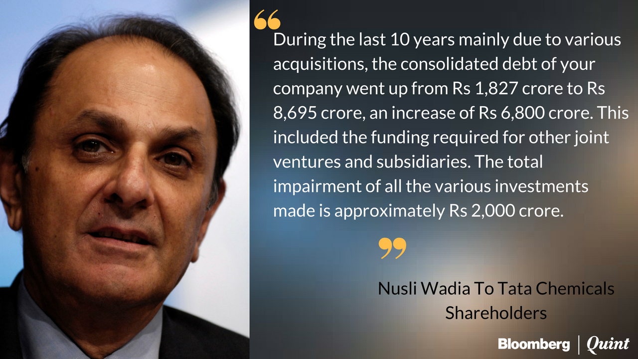 Tata Chemicals Ltd. faced impairments to the tune of Rs 2,000 crore in ten years due to ill-advised investments, according to Nusli Wadia.