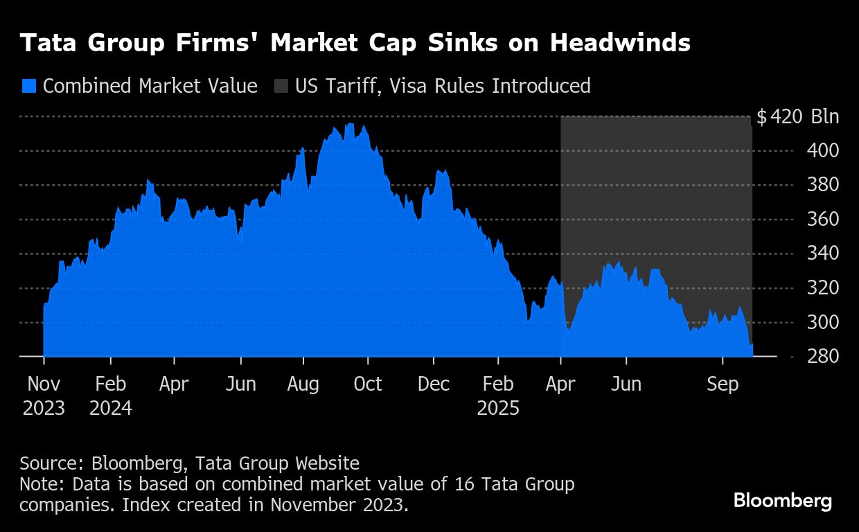 The combined market value of the biggest Indian group's 16 firms has slipped to about $287 billion, the lowest in nearly two years, data compiled by Bloomberg show. The group lost about $19 billion since Sept. 19 after President Donald Trump tightened US work-visa rules, weighing on Tata Consultancy Services Ltd.