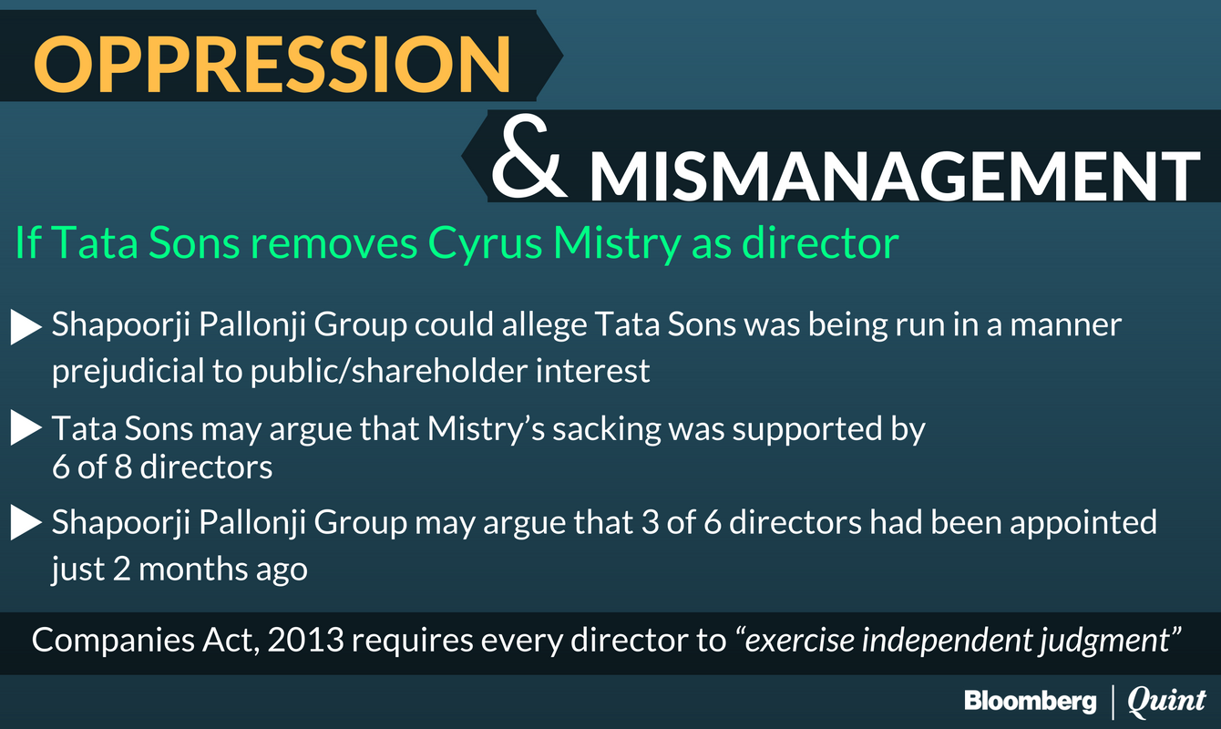 Some lawyers argue that removing Mistry from the Tata Sons board might give the Shapoorji Pallonji Group grounds to pursue legal action under the prevention of oppression and mismanagement provision in company law.