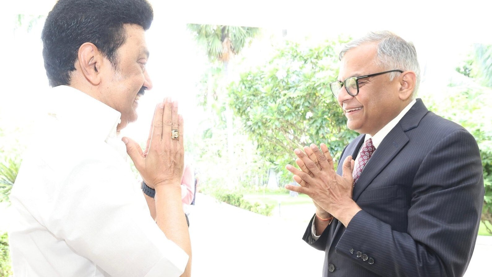 Tamil Nadu Chief Minister MK Stalin with Tata Sons Chairman Natarajan Chandrasekaran following the groudbreaking ceremony of Tata Motors' Ranipet plant on Saturday, 28 September 2024. (Photo: @mkstalin/x)