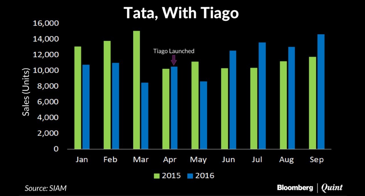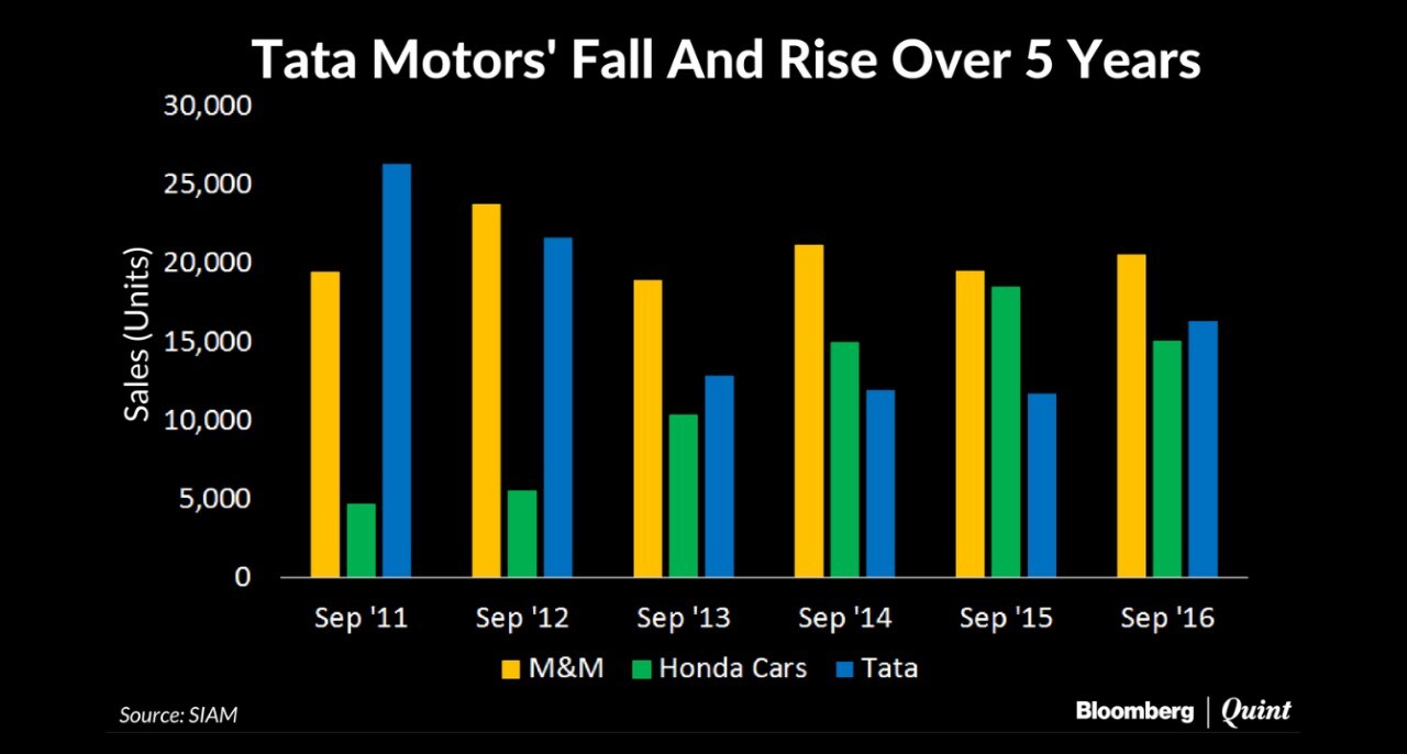 Tata Motors lost the third position to Mahindra & Mahindra in 2012, and fourth to Honda Cars India in early 2014, in terms of total sales. From 26,319 units in September 2011, the automaker had been reduced to 11,931 units by September 2015.