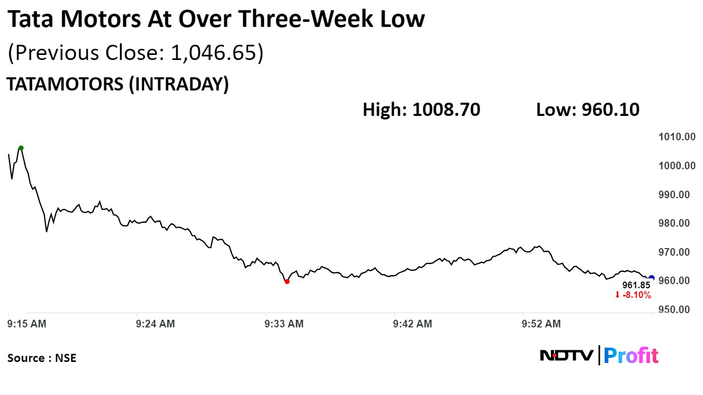 Shares of Tata Motors declined as much as 8.27% to Rs 960.10 apiece, the lowest level since April 19. It was trading 7.89% lower at Rs 963.65 apiece as of 09:56 a.m. This compares to a 0.87% decline in the NSE Nifty 50 Index.