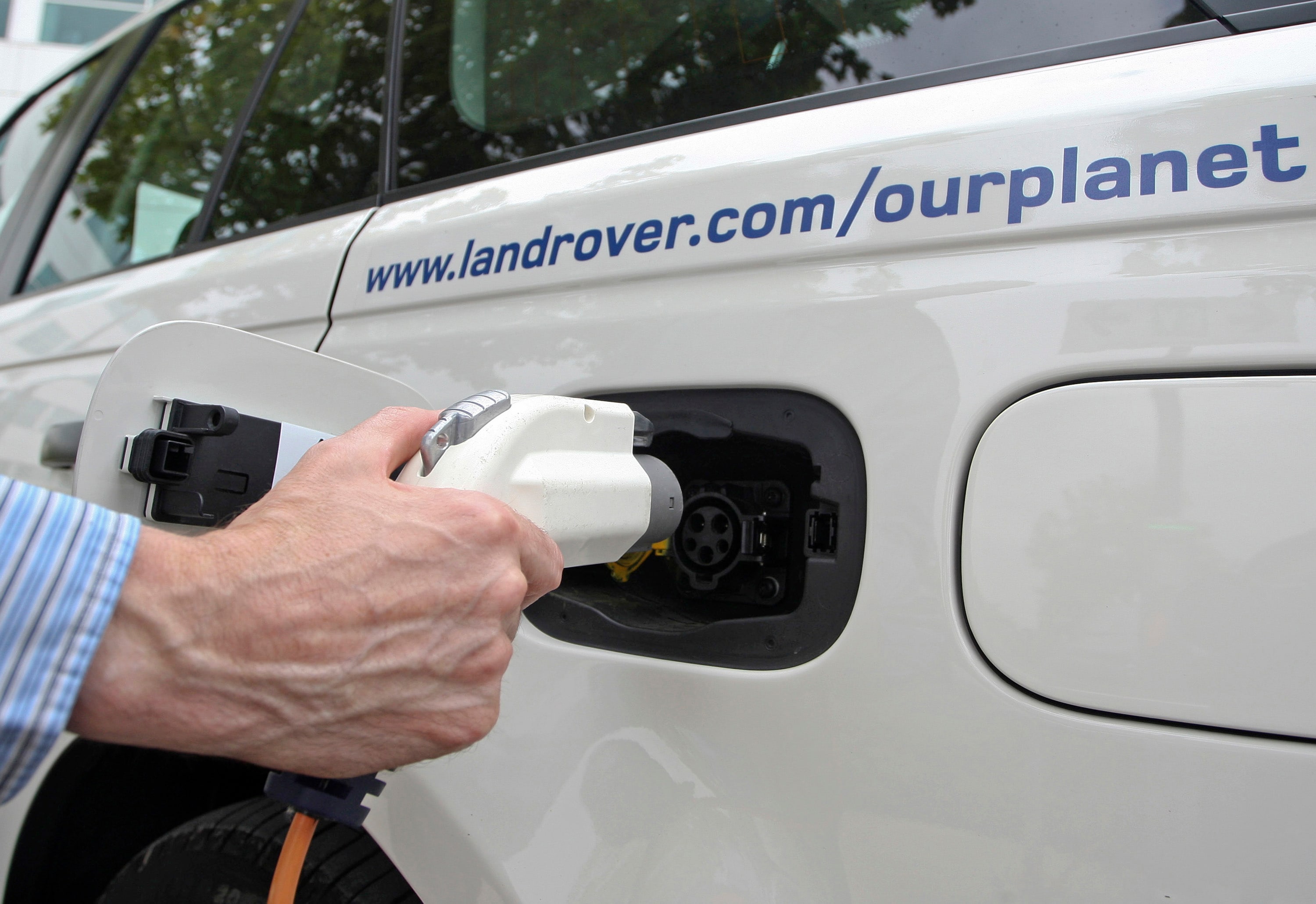 An employee prepares to charge a Jaguar Land Rover Plc Range_e diesel-electric hybrid vehicle, based on a Range Rover Sport. (Photographer: Chris Ratcliffe/Bloomberg)