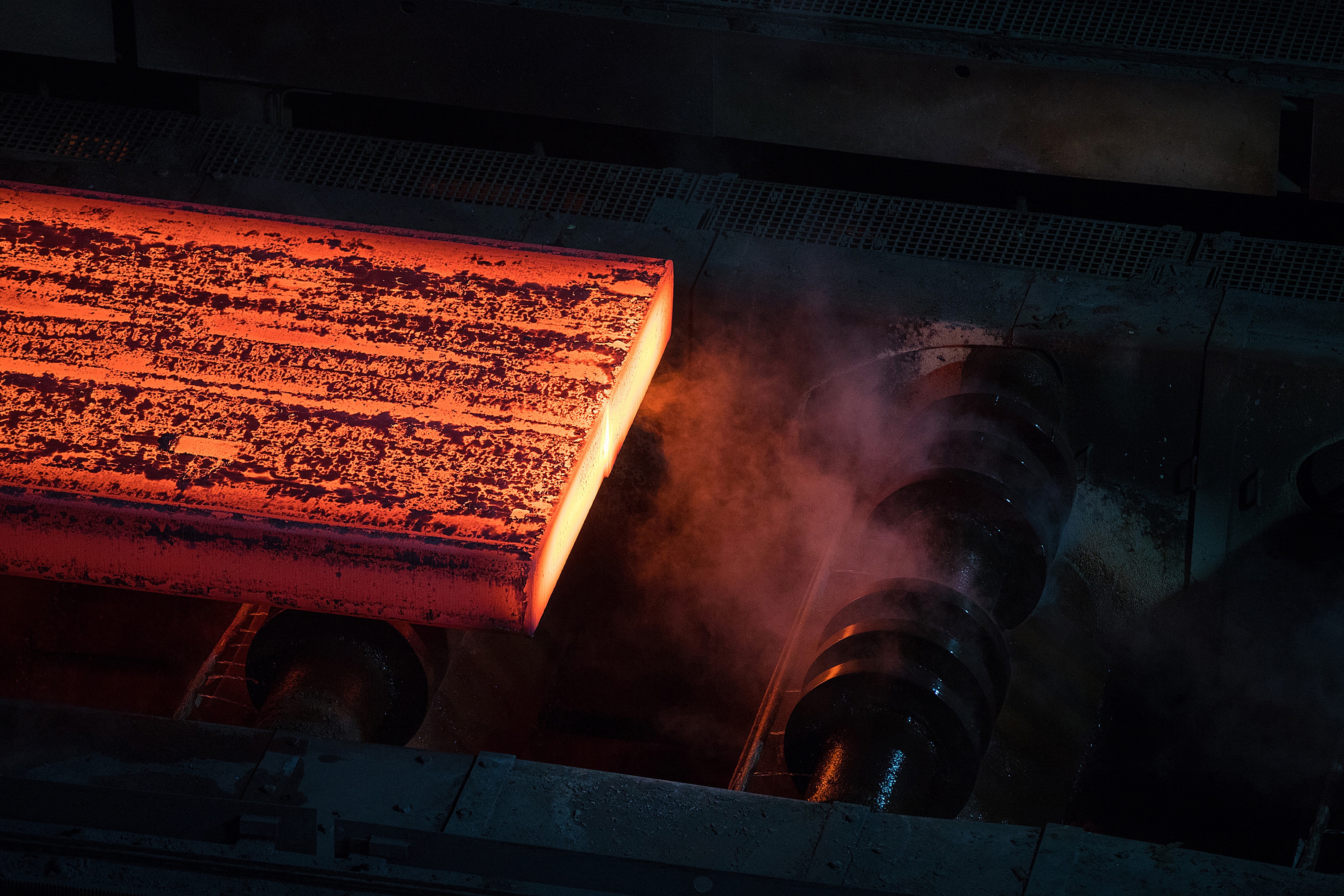 A red hot steel slab passes along a rolling machine. (Photographer: Krisztian Bocsi/Bloomberg)