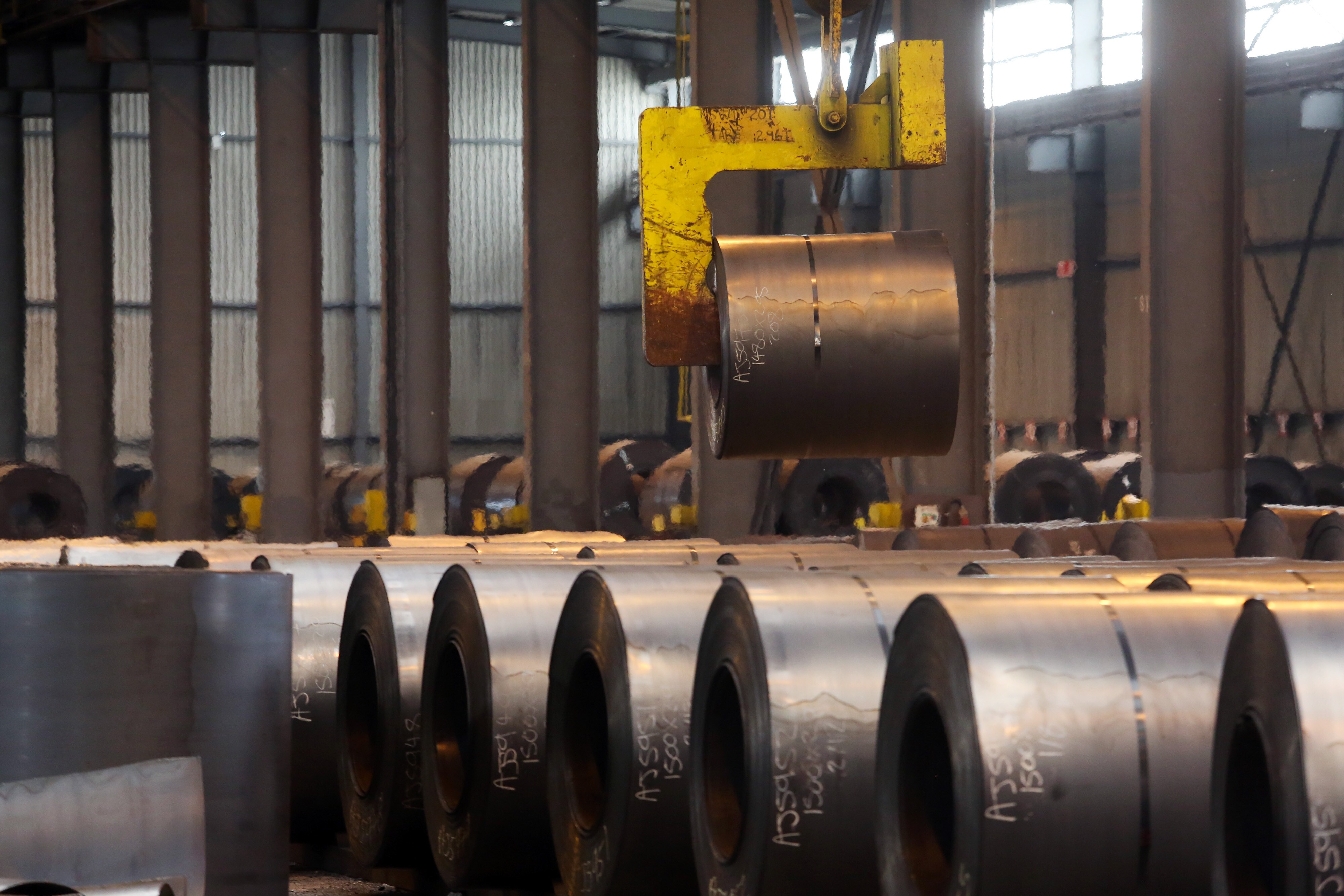 A crane carries a roll of coiled steel (Photographer: Chris Ratcliffe/Bloomberg)