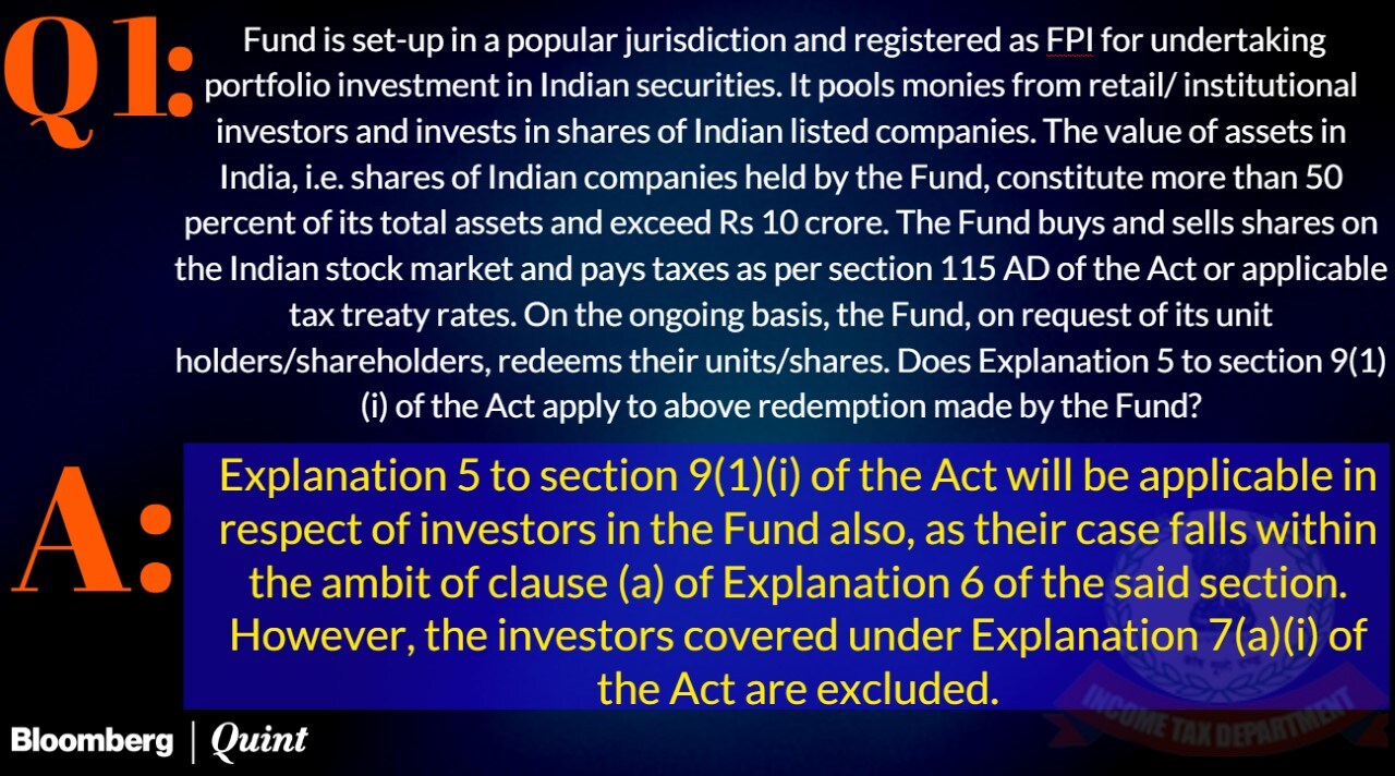 In the very first one the CBDT has clarified that if an investor or unit holder owning 5 percent or more in a fund registered as an FPI in India sells or redeems the shares or units, and the Fund has 50 percent or more of its money invested in India, then the investor will be liable to tax in India. Even though the Fund, when it buys and sells equity shares in India pays the relevant taxes.