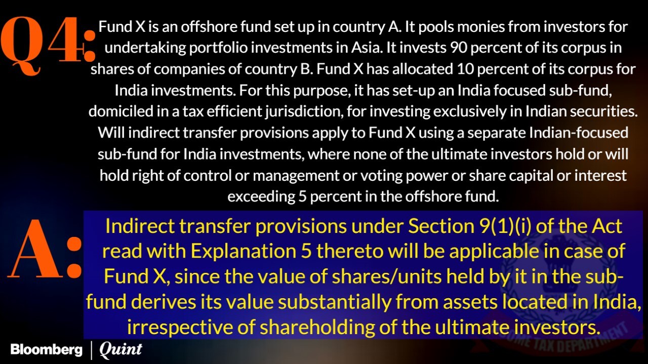Another question asks if tax is applicable in the case of an overseas fund transferring its units or shares in a sub-fund focused on India. The answer is yes.