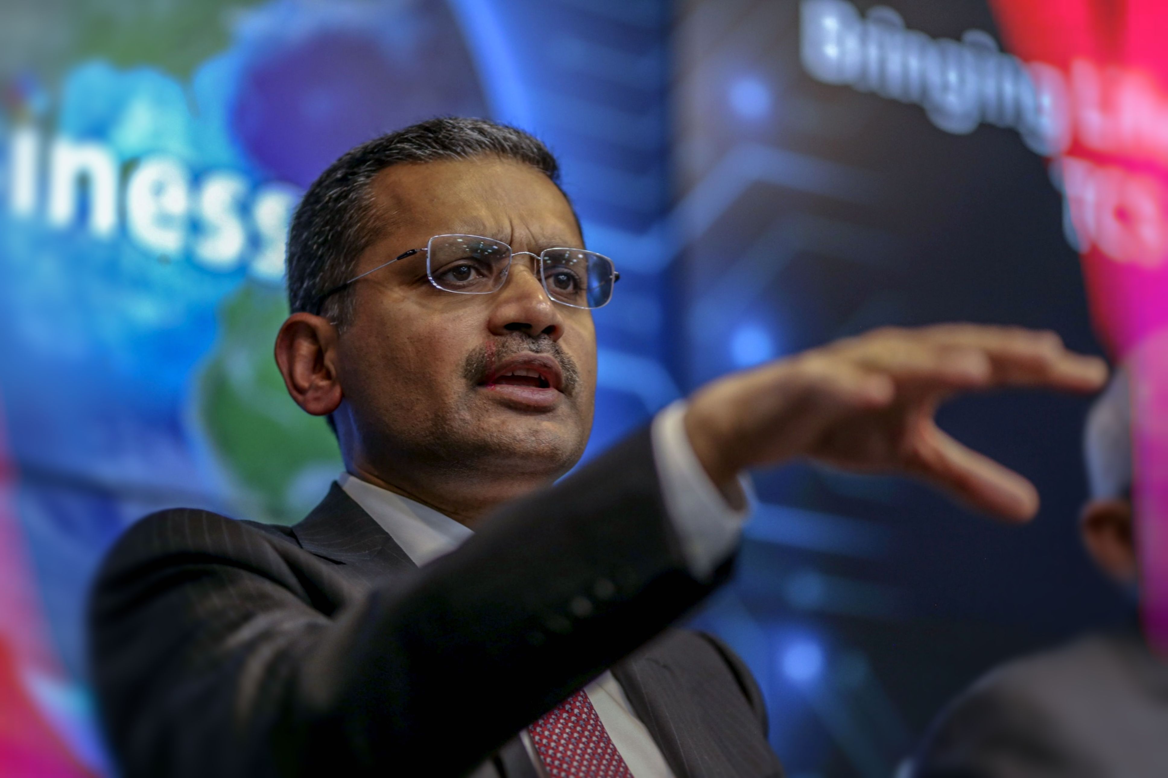 Rajesh Gopinathan, chief executive officer of Tata Consultancy Services Ltd., gestures while speaking during a news conference. (Photographer: Dhiraj Singh/Bloomberg)