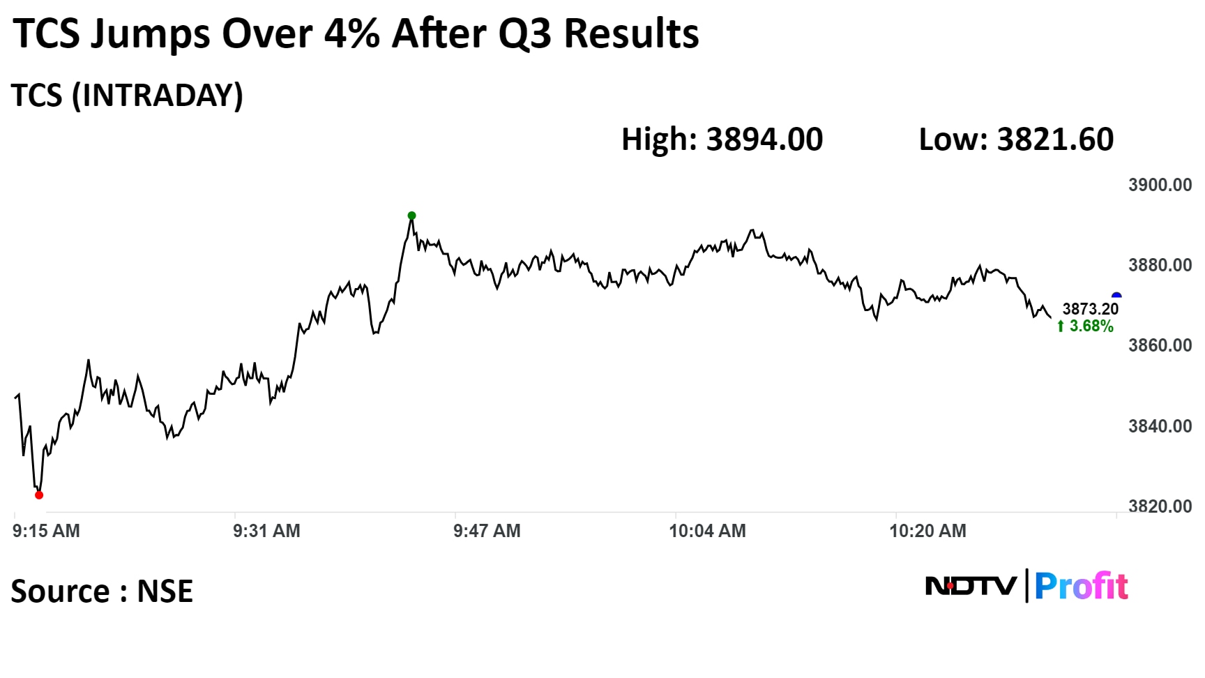 On the NSE, TCS's stock rose as much as 4.24% during the day to Rs 3,894 apiece, the most since Dec. 15, 2023. It was trading 3.5% higher at Rs 3,866.40 apiece, compared to a 0.75% advance in the benchmark Nifty 50 as of 10.36 a.m.