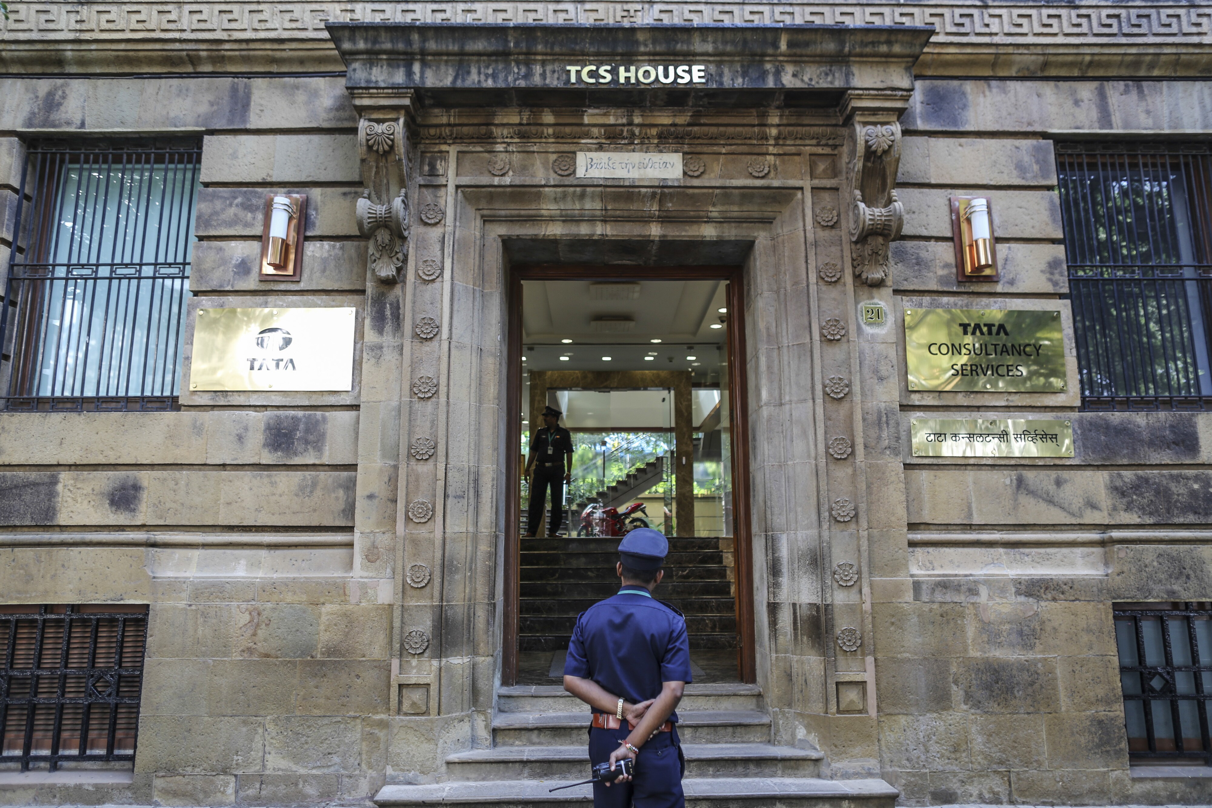 A security guard stands outside the Tata Consultancy Services Ltd. headquarters in Mumbai, India (Photographer: Dhiraj Singh/Bloomberg)