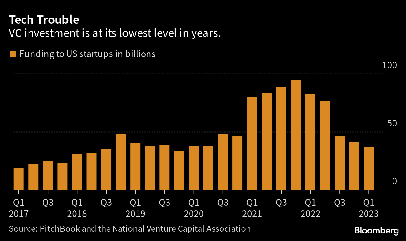 US startups raised $37 billion from venture capitalists in the first quarter of this year, the lowest amount in 13 consecutive quarters, according to data from research firm PitchBook and the National Venture Capital Association. Investors have reduced both the size and number of checks they write. The first quarter marked the lowest number of deals, fewer than 3,000, in more than five years.