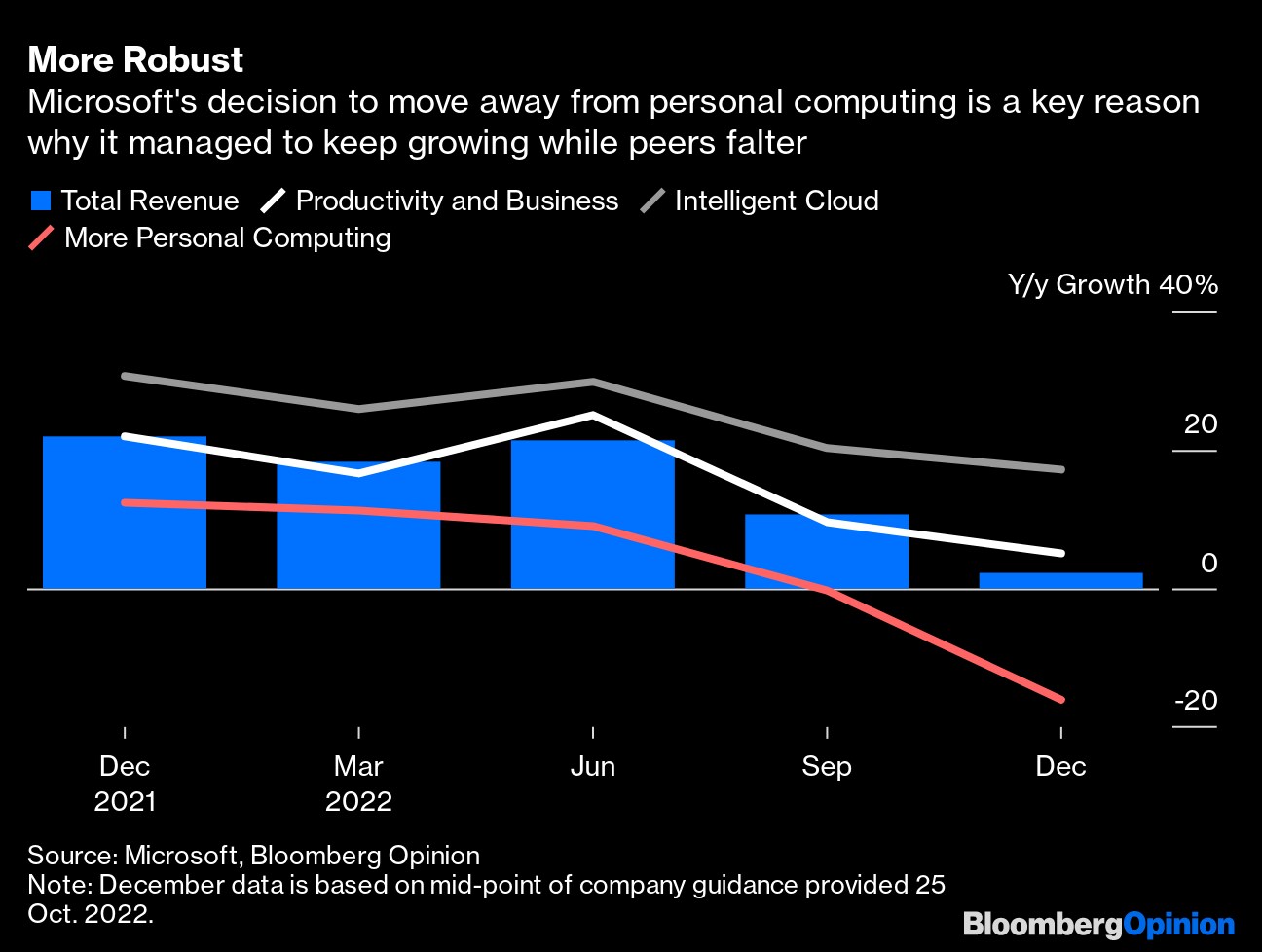 Over at Microsoft Corp., a decade-long transition away from client computing — where revenue is directly tied to sales of computer and server hardware — is helping it weather the storm better than most. Revenue for the September period climbed just 11%, the slowest in five years, yet that's much better than most tech peers. Its cloud and productivity offerings are the major reasons for this relative strength. Customers — both consumer and corporate — are somewhat wedded to its suite of Office products, while those who have signed up for its Azure cloud services aren't in a position to flee when times get tough.