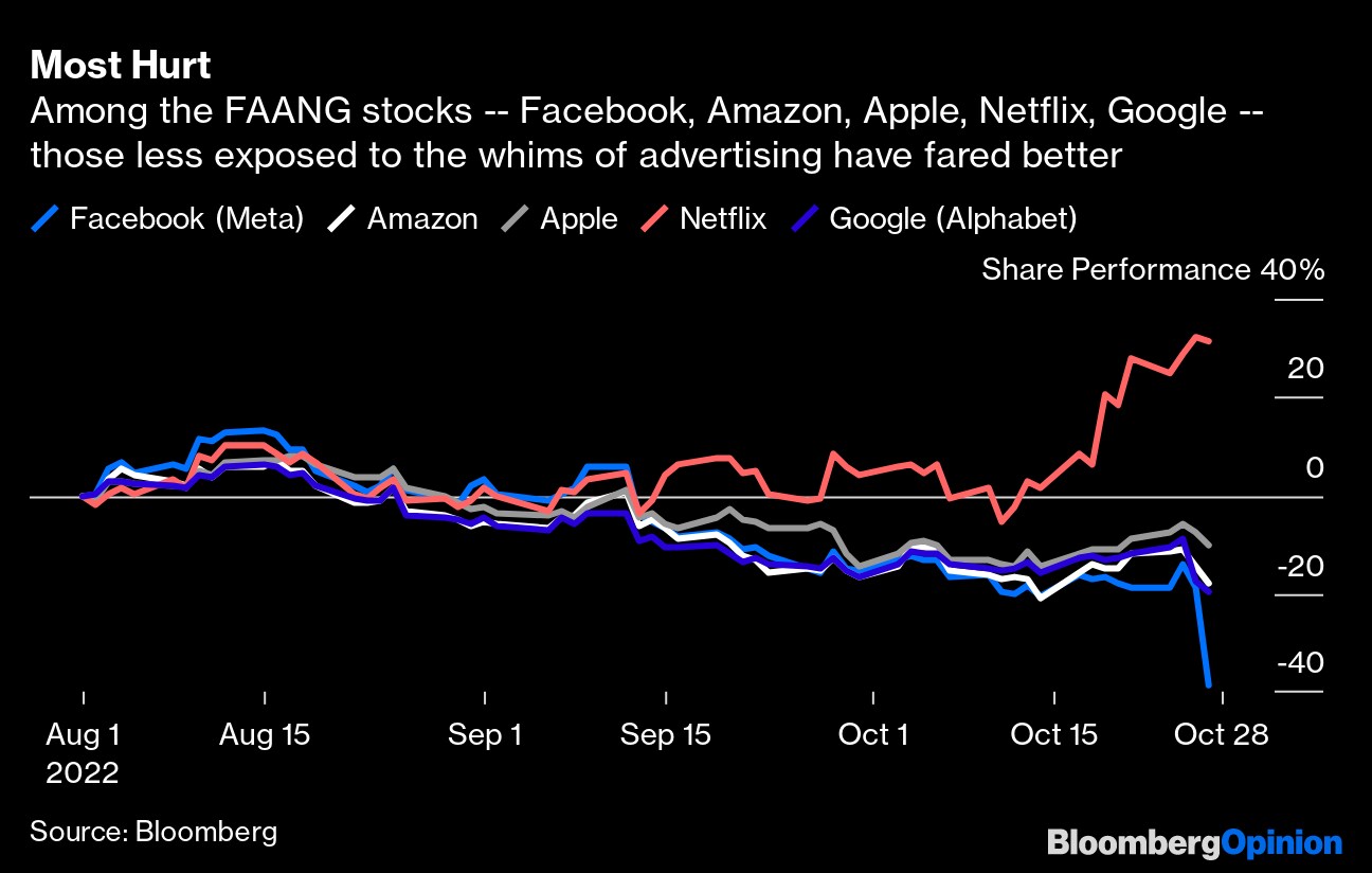 Meta Platforms Inc. is being hit from all sides. The owner of Facebook, Instagram and WhatsApp has been severely damaged by changes to Apple's privacy rules, which makes it difficult to track users across apps and thus drives down advertising rates. The global downturn, including higher inflation, just adds to the woes. Although user numbers are slowly ticking up — it has 3.7 billion monthly active users across its family of apps — average revenue per person is sliding.