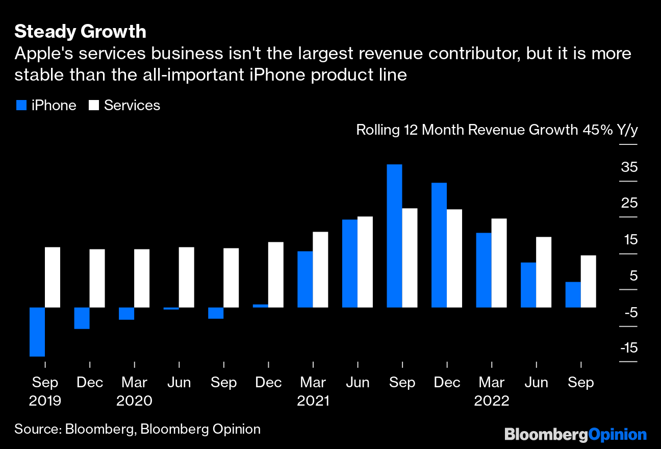 Apple Inc. looks relatively strong compared with all the rest. Its iPhone did quite well, though a touch below estimates and boosted by a few more days of availability. Services, the division that includes Apple Music and Apple+ TV that is the company's second-largest contributor to revenue, continued to post solid growth, albeit at a slower rate than previous quarters.