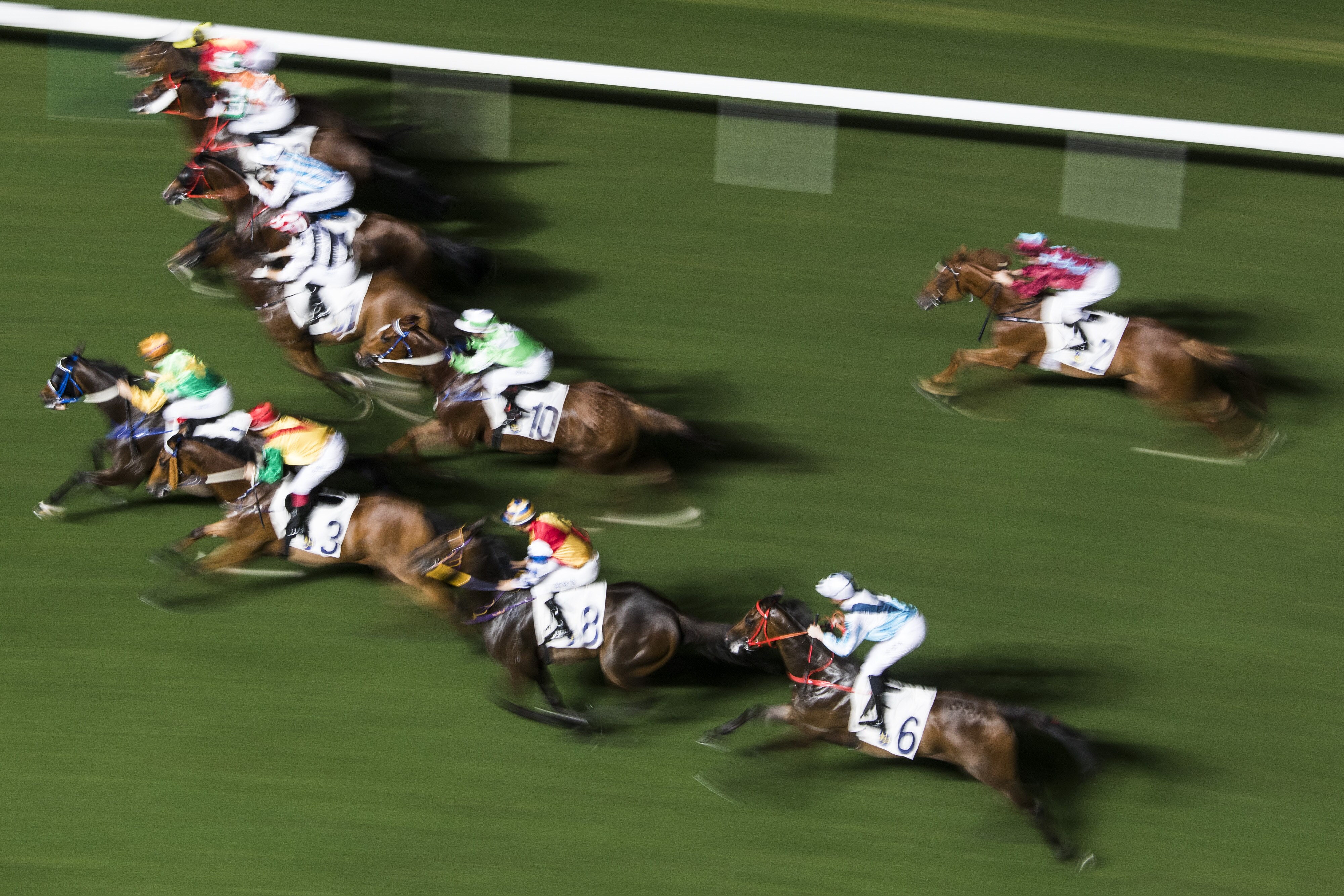 Horses gallop on the track during a race. (Photographer: Justin Chin/Bloomberg)