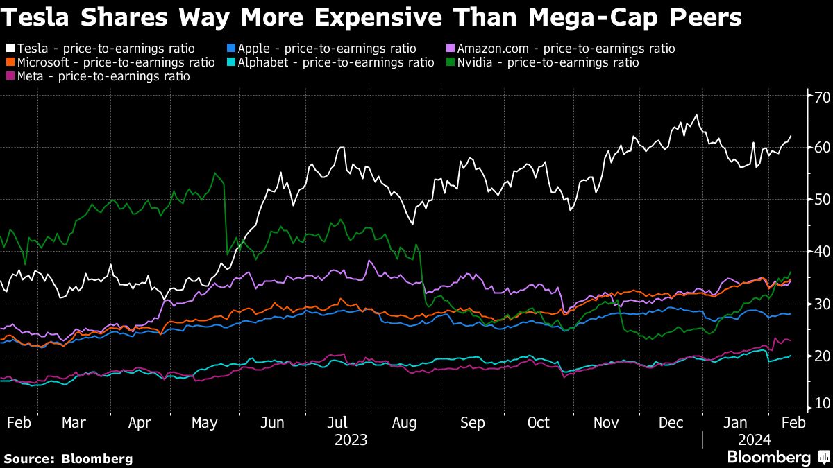 The double trouble of slowing EV demand and shaky AI credentials make it hard for investors to swallow Tesla's sky high valuation. Even with this year's selloff, the stock trades at over 60 times forward earnings. The second-most expensive Magnificent Seven stock is Nvidia Corp. at around 36 times forward earnings, while the rest trade between the low twenties and low thirties.