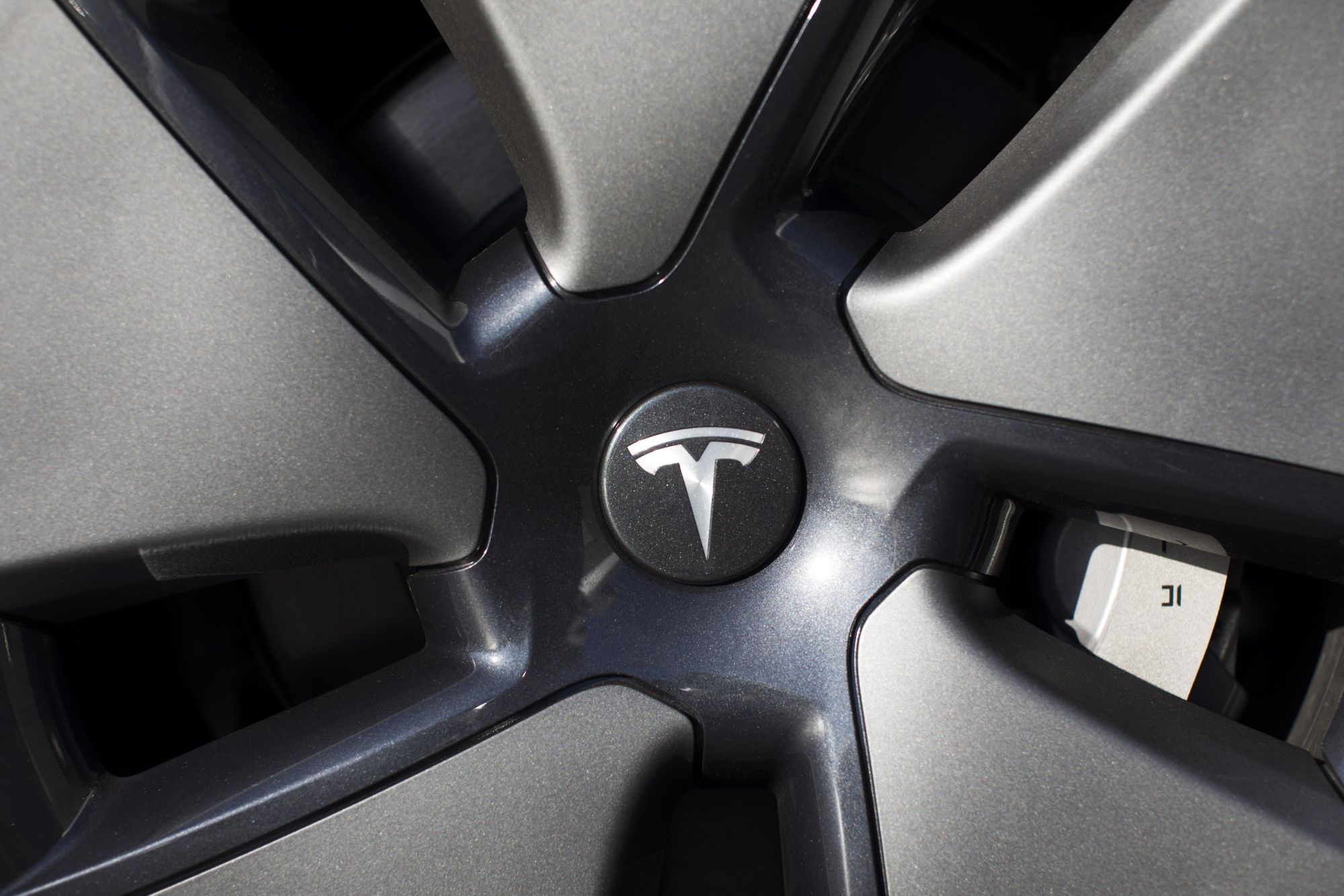 A logo on a wheel of an Tesla Inc. electric vehicle at the automaker's temporary test drive center in Sydney, Australia, on Monday, April 12, 2021. Tesla and the electric-car industry generally thrive in the world’s richest nations. Not so in Australia, where even tractors outsell EVs two to one.