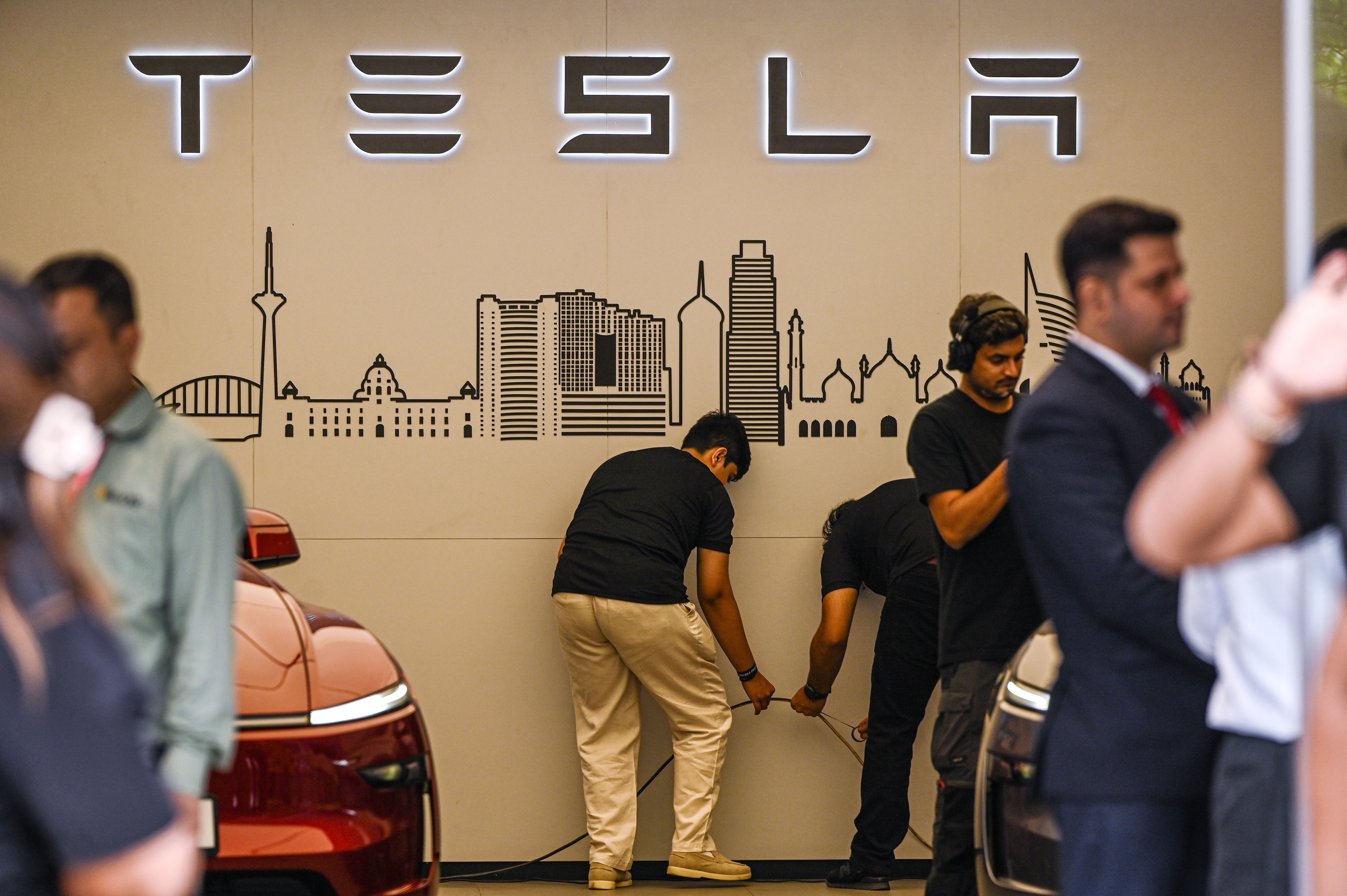 Workers prepare for the opening of the new Tesla Inc. store in New Delhi on Aug. 11, 2025. (Photo: Prakash Singh/Bloomberg)