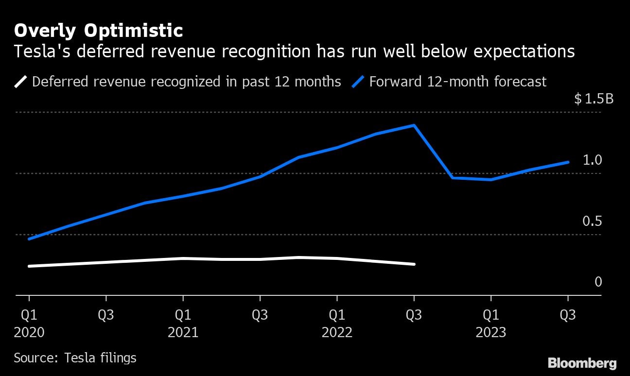 At the end of September, Tesla's deferred revenue balance was at $2.8 billion. While the company said then that it expected to recognize $1.09 billion of deferred revenue in the coming 12 months, Tesla has for years overestimated this figure.