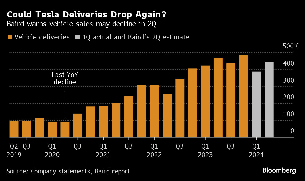 (Bloomberg) -- Tesla Inc. may be headed for another vehicle sales decline this quarter after surprising investors with a drop in the first three months of the year, according to Robert W. Baird analysts.