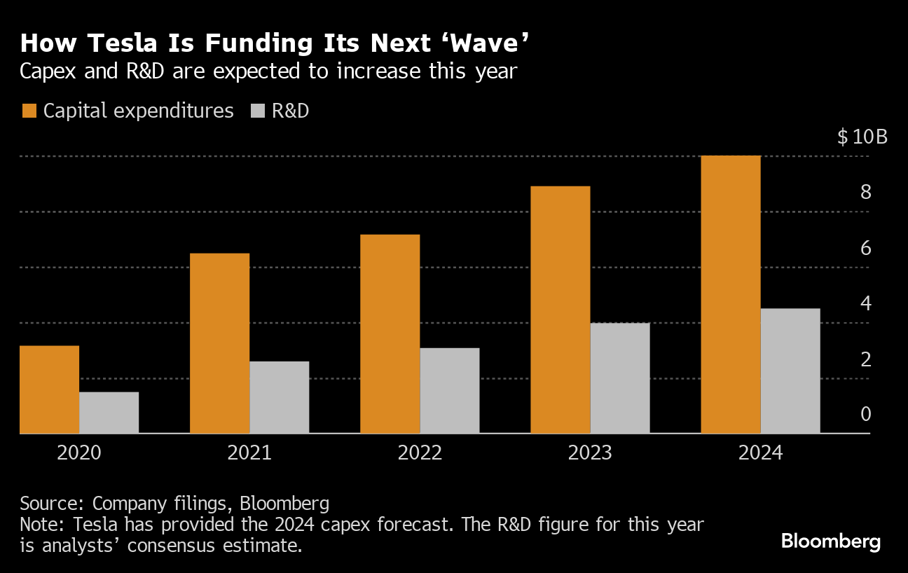Tesla has flagged ample spending toward that next-generation electric vehicle and other growth initiatives, budgeting more than $10 billion in capital expenditures this year. Analysts also are expecting the company to increase spending on research and development to about $4.5 billion.