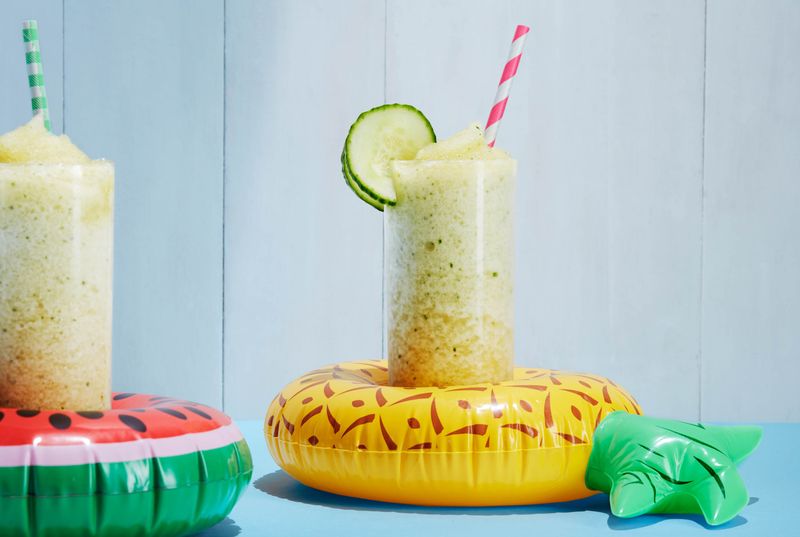 A frozen Spicy Swimsuit is the best drink for the pool. Acrylic Buswell Collins glass ($29.99 for six) by Cocktail Kingdom. (Photographer: Janelle Jones/Bloomberg; Food Stylist: Liza Jernow; Prop Stylist: Anna Surbatovich)