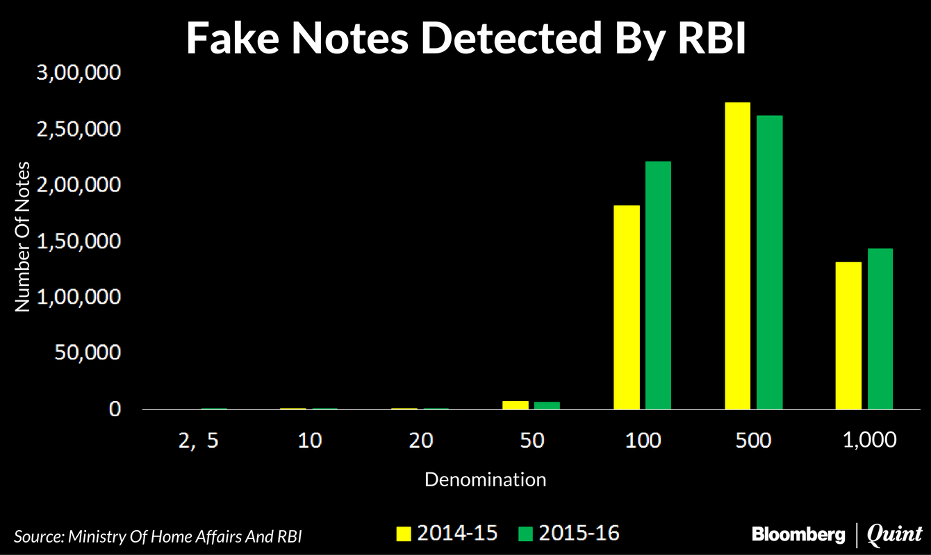 According to the Reserve Bank of India's annual report published this year, more than 2.61 lakh counterfeit notes in the denomination of Rs 500 were detected by banks in the year 2015-2016 while another 1.43 lakh fake notes of Rs 1000 were detected. By value, counterfeit notes of Rs 500 and Rs 1000 accounted for more than 92% of all the fake currency detected by banks across the country.