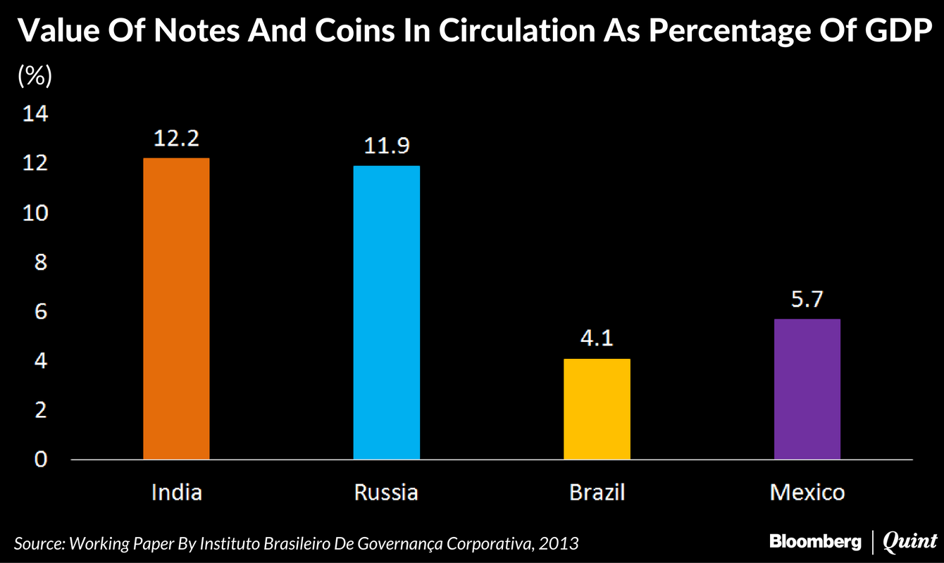 India has a high rate of circulation of liquid currency in the economy which makes up 12.2 percent of the gross domestic product in India, higher than Russia's 11.9 percent and China's 4.8 percent, according to a research paper published by Instituto Brasileiro de Geografia e Estatística in 2013. The agency is a government body responsible for statistical information in Brazil and studied the use of cash across key emerging economies.