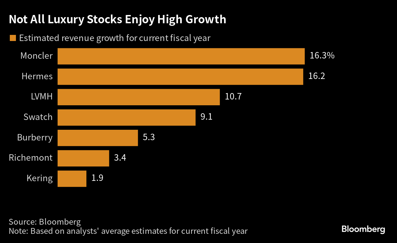 “Many brokers have revised their target prices and I think that the consensus was a little too high,” Vacossin said, adding that he has reduced his positions in LVMH and Hermes. Those two companies, like Moncler SpA and Swatch Group AG, are expected to post double-digit growth in their current reporting years.