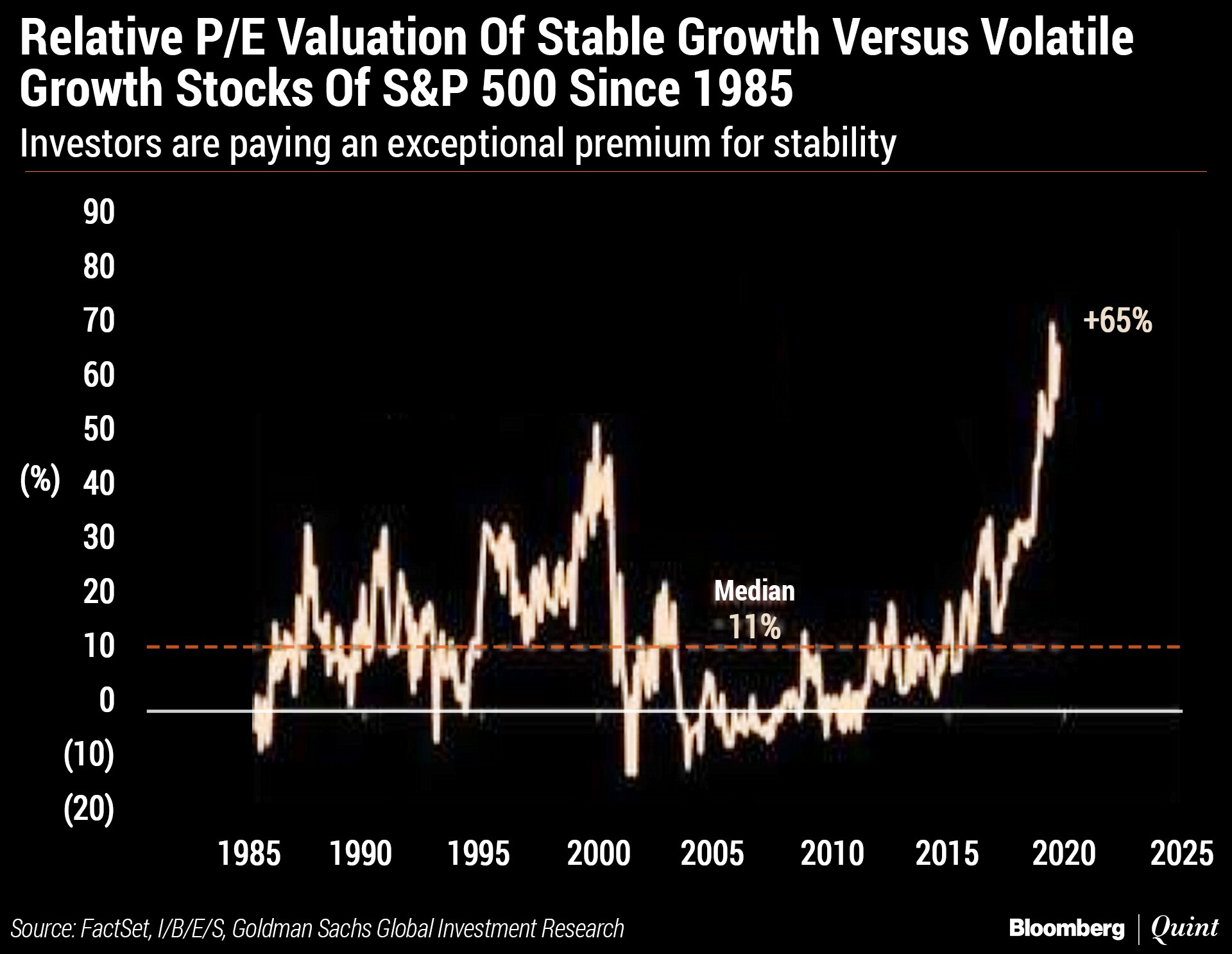 All the above has led to a unique phenomenon: A bipolar market where the concepts of consistency, quality, stable earnings, low volatility, and perceived safety have done disproportionately well while the other side of the markets languishes due to investor apathy. A recent report by Goldman Sachs also highlights that an index of “stable earnings” U.S. companies is now trading at an all-time high 65 percent premium to “volatile growth” companies