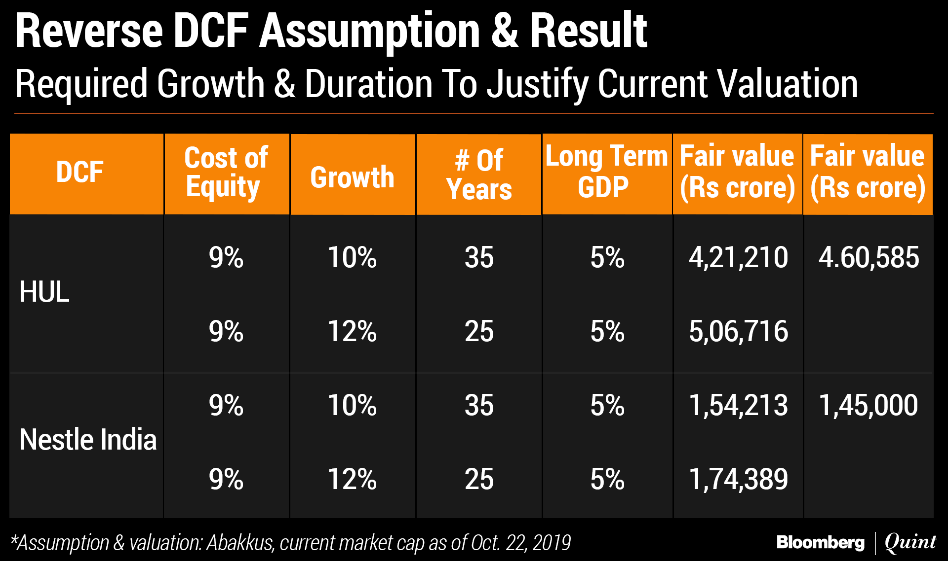 Intrinsic valuation of Indian FMCG companies like HUL, Nestle shows they will have to grow at 10 percent for a staggering 35 years or at 12 percent for 25 years to merely justify current valuations.