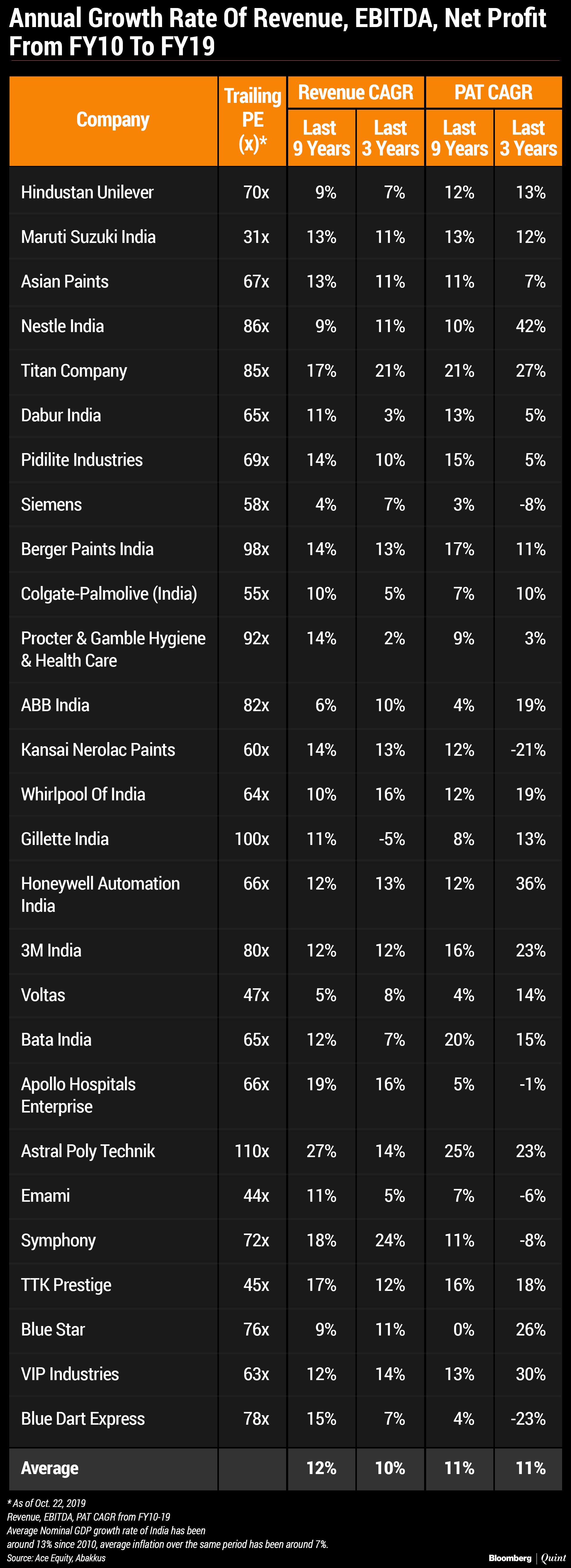 Colgate India for example has grown revenues at a CAGR of 10 percent and profit at a CAGR of 7 percent over FY10-19. One important reason presented for the high P/E ratios for these companies is stable and higher growth. This data of growth is not too different than nominal GDP growth, thus making the argument of 50x-75x P/E multiples based on higher growth untenable.